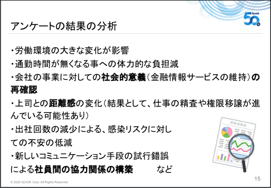 テレワークになり、通勤時間がなくなったのはもちろん大きなプラスですが、会社の事業の社会的意義の再確認があったと思います。弊社は金融情報サービスということで、日経平均株価の算出を日々行っています。きちんとサービスを提供し続けるということが社会的意義につながるということを再確認することが出来たのではないかと思っています。