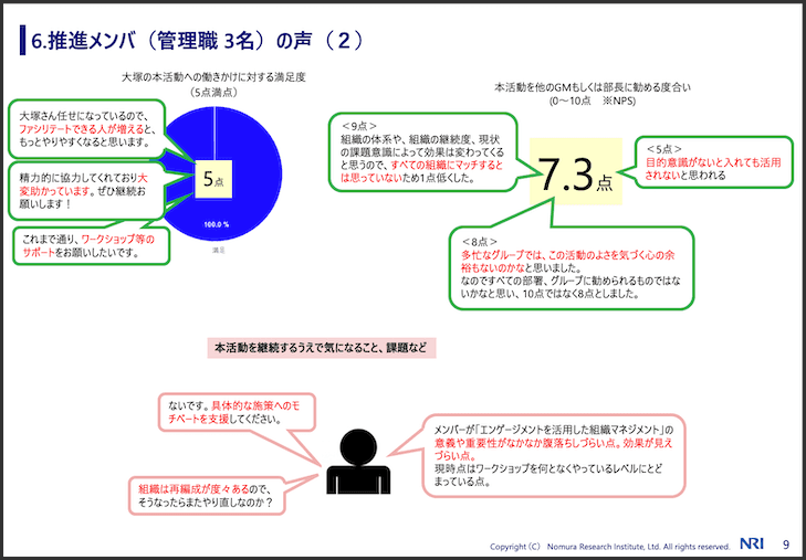 ここで社内の3人のGMに事後アンケートをとったので、彼らの声を紹介したいと思います。組織マネジメントに伴走者をつけるという今回の形はポジティブな意見をいただきました。また、「月1でサーベイを取って、サイクルを回していくというやり方がNRIという組織にマッチするか」という質問に対しても、概ねポジティブな回答はもらえたのですが、「マネージャーが組織改善の必要性を理解していないとあまり意味をなさない」という声があったのが印象的でしたね。その通りで、初期の段階に伴走者をつけることで、推進者の目的意識を高めることが重要だと感じました。合わせて、対話の数を増やしてチームの結束を強めることも有効なのかなと思っています。