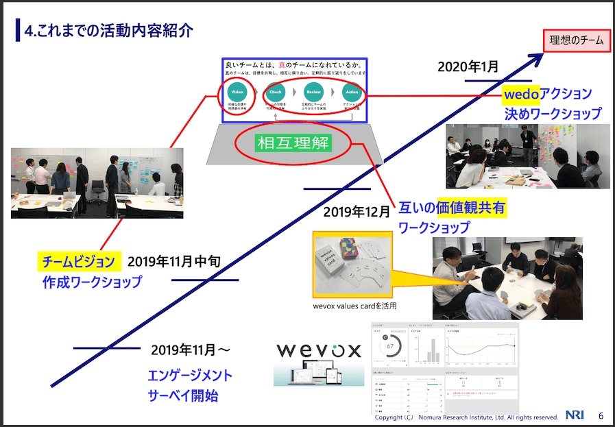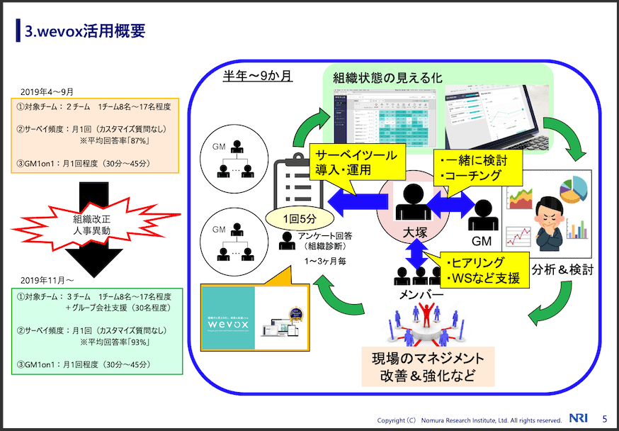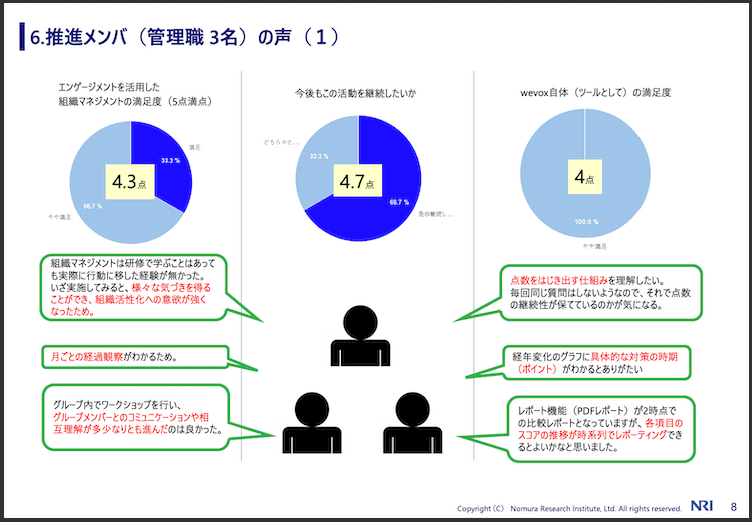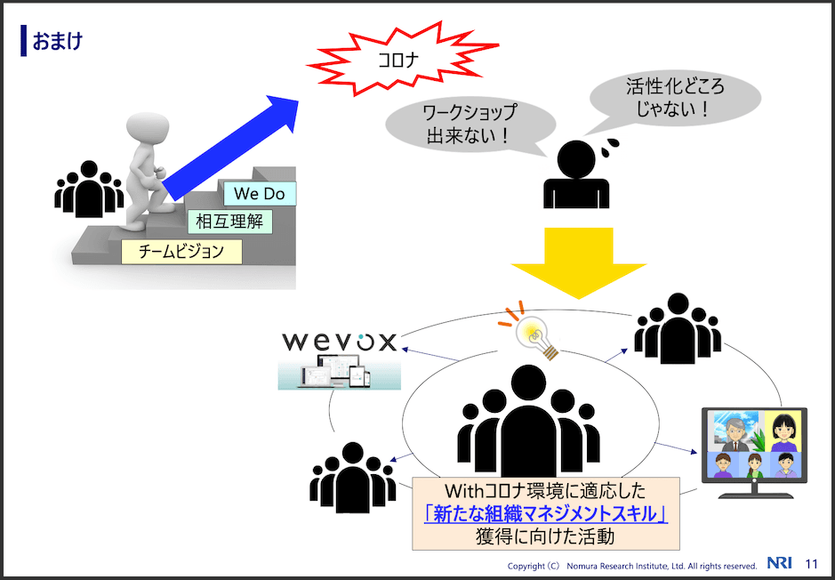 「コロナでそれどころじゃない」という声も一部挙がっていますが、引き続き社外の組織開発担当の方と知見をシェアしながら、今の環境に適応した新たな組織マネジメントスキルを獲得していきたいです。そして、NRIの組織に合った組織改善、マネジメントの手法を確立して、ゆくゆくは本部全体にwevoxを活用しての「自発的な組織開発力獲得/向上」の取り組みを拡げていきたいと思っています。本日はありがとうございました。