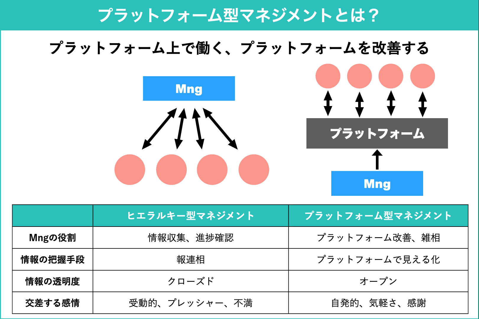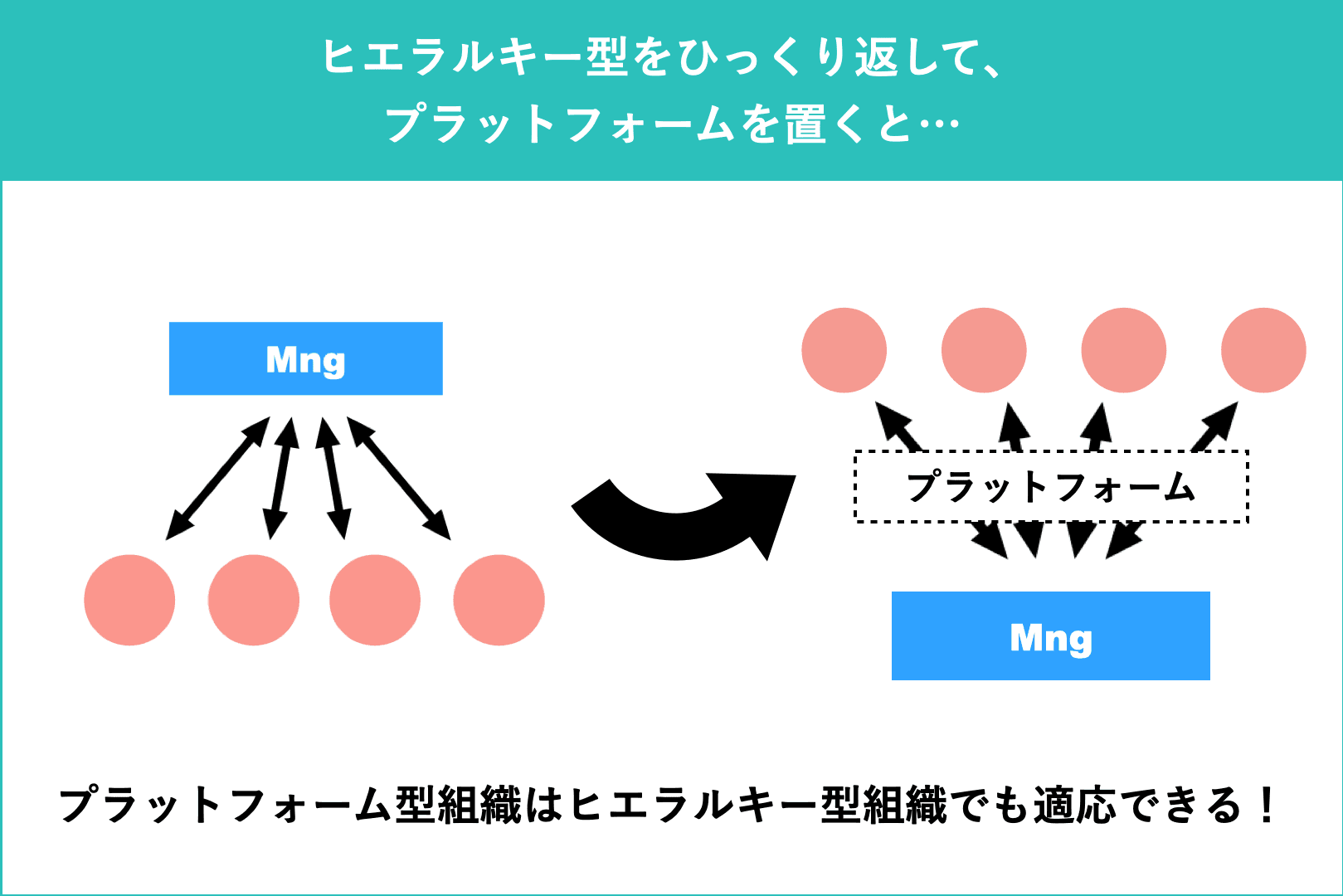 でも、変えるのではなく「ひっくり返す」ことならできるはずです。従来のヒエラルキー型の組織構造をひっくり返しちゃえば、プラットフォーム型の組織の形はできる。あとは、マネージャーのマインドセットや行動を変えていけばいい。