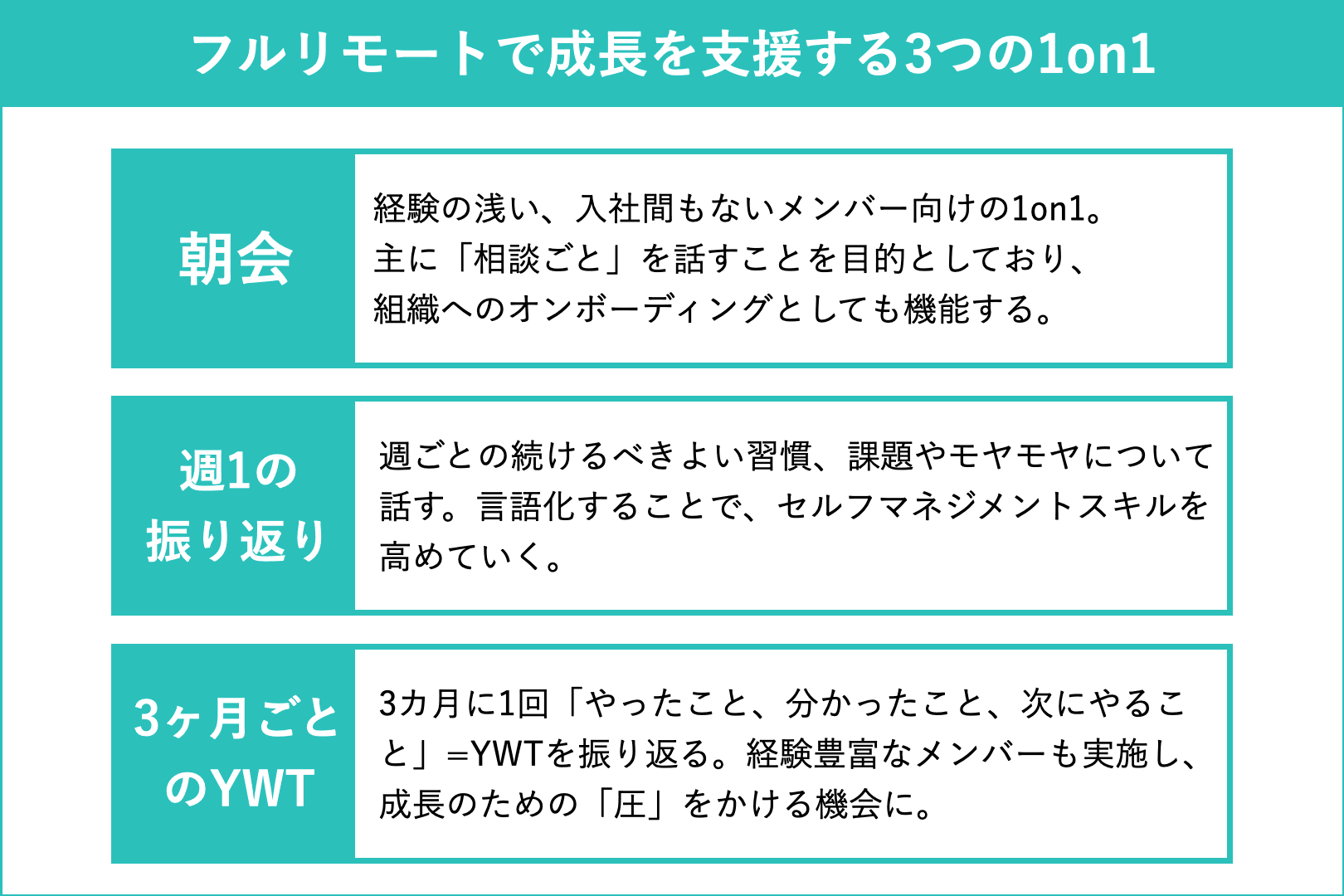 「朝会」「週1の振り返り」「3カ月に1度のYWT」という3つの軸の1on1です。1つずつ説明していきましょう。