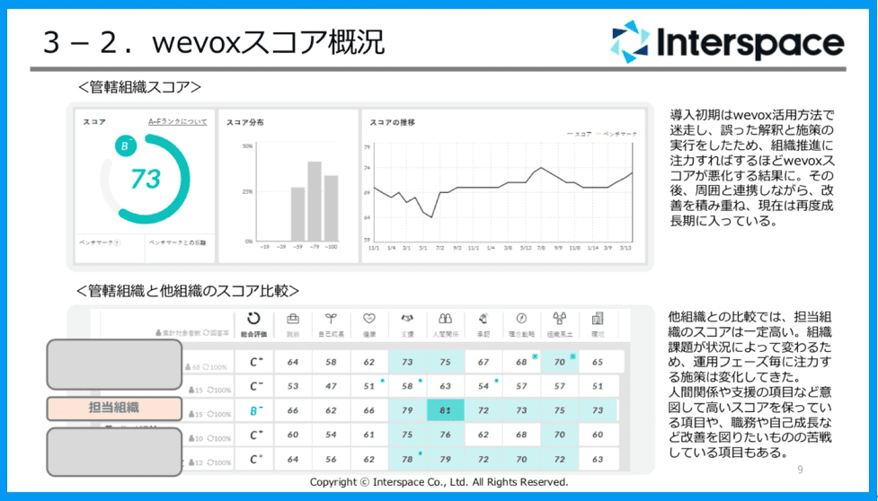 アンケート回答者である従業員の心理的安全性を担保するという目的で、匿名回答で運用しています。そのためwevoxスコアにおいて、個人の特定はできません。そのスコアは1on1で活用したり、wevoxをもとにした改善アクションや事例は、社内の他マネージャーとの共有を行っています。