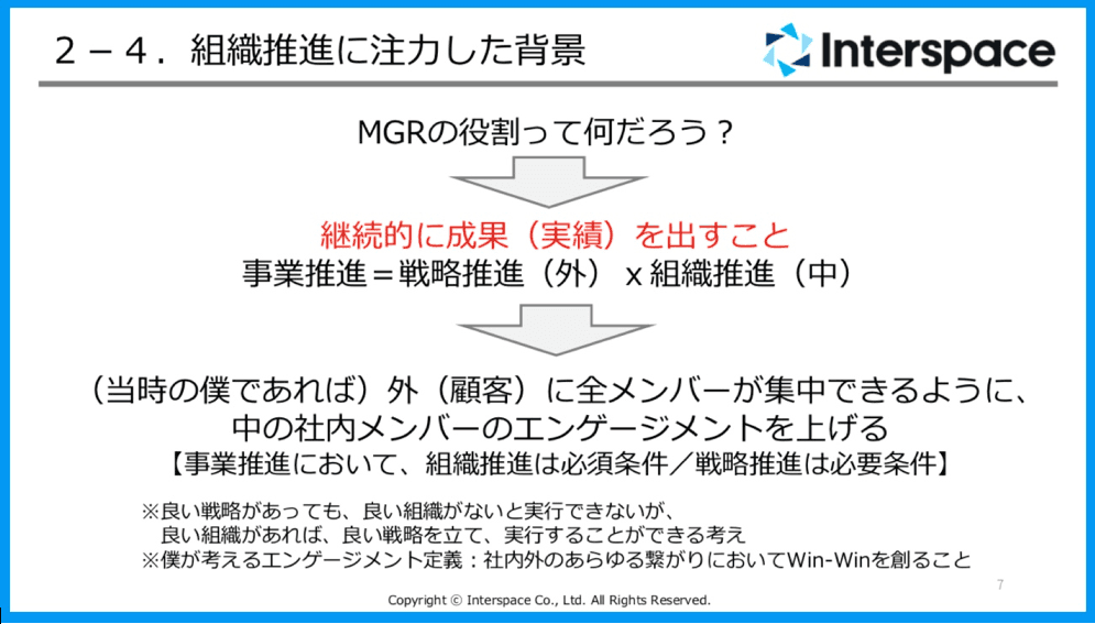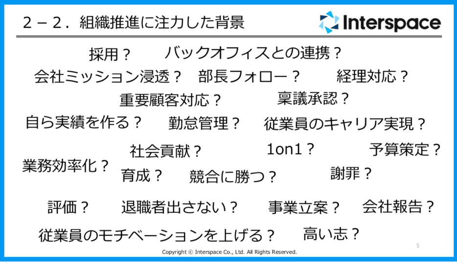 私が組織推進に注力し始めた背景をお話しします。私は営業部門のマネージャーなので、社内での役割はもちろん継続的な営業実績を組織として作ることです。マネージャーになってちょうど3年ぐらいになるのですが、その前はメンバーとマネージャーの間に位置する管理職、弊社ではリーダーと呼ばれる役職に就いていました。リーダーからマネージャーに昇格したときに、中間管理職ならではのタスクが増えて、何をしていいのかわからない状態でした。