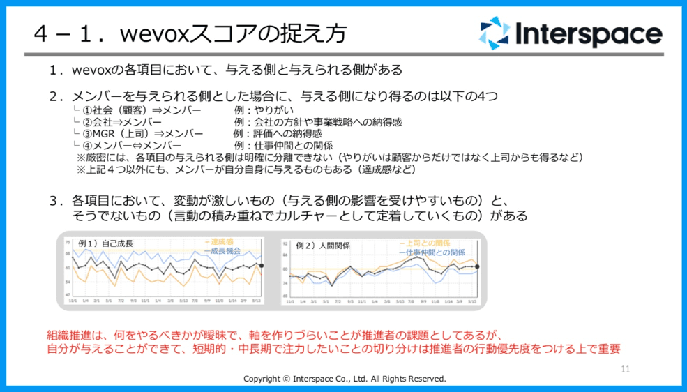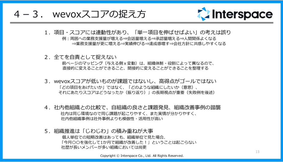 3つ目。スコアが低い項目が課題でもないし、高スコアを取るのがゴールでもないと今は思っています。というのも、低いスコアの項目を上げて、組織の労働満足度は上げたのに、業績は落ちているというエンゲージメントの築き方を間違った経験があるんです。またキャリアや社歴に応じて、スコアのベース値の高さは違うことを発見しました。それ以降、自分たちがありたい組織に対して、適切に進んでいるかを後付けで確認する組織状態の把握ツールとしてwevoxを捉えるようになりました。