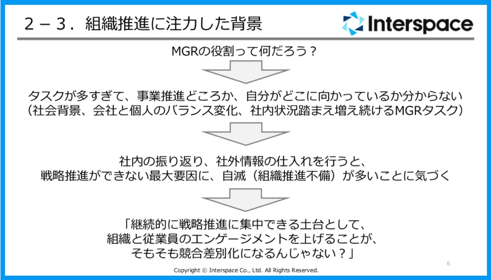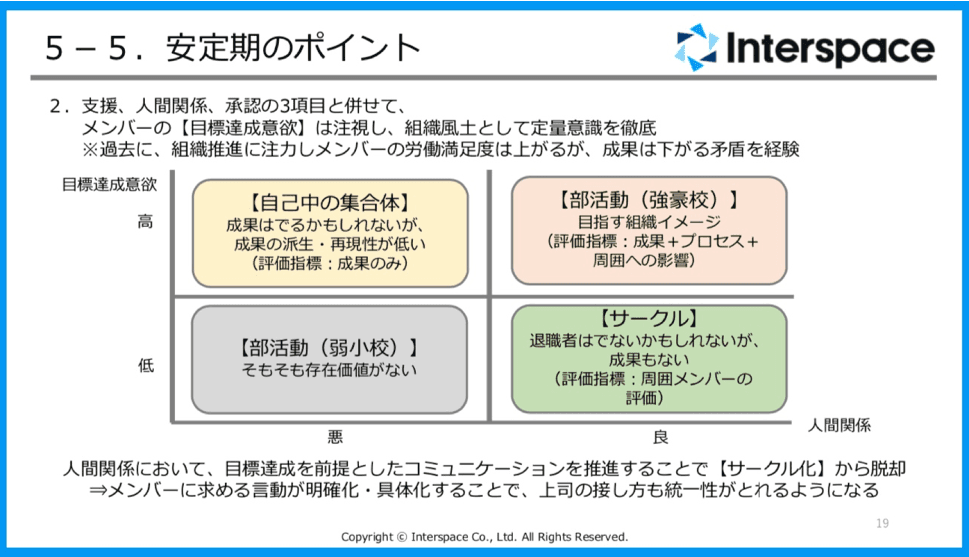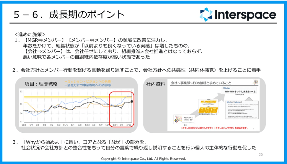 最後は成長期。メンバーとグループの適切なエンゲージメントが築けていると感じていたものの、マネージャーが与えることができないことがあって、例えば会社環境の整備や理念への納得感の醸成とった動きは経営層からのアプローチがないとスコアが上がらないとは思っていたのですが、経営と従業員の間にいるマネージャーの職務怠慢もあると思うようになりました。なので、メンバーが自グループだけじゃなく会社との繋がりに意識を向けられるように、一歩踏み込むことにしたのです。