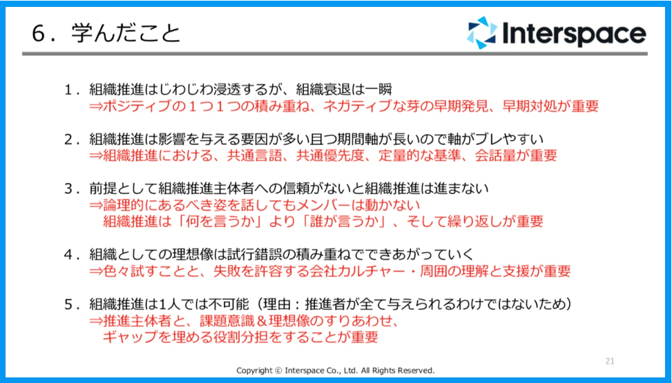 最後に5点目は、組織推進は今日やったことが明日の改善に繋がることは、ほとんどなく、毎日の積み重ねが「じわじわ」と変化として表れて、カルチャーとして定着していくので目先の成果は求めず、根気強く試行錯誤を繰り返すことを大事にしています。