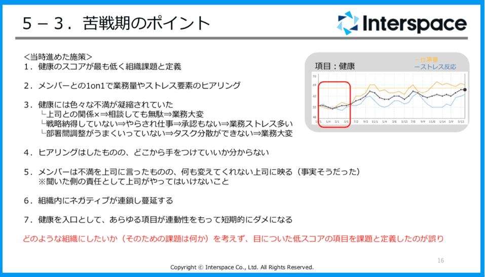 しかし、1on1を通じて「健康」の課題の蓋を開けるといろんな課題が凝縮されていました。上司との関係も駄目で、業務量も多く、他部署との連携には不満があり、戦略にそもそも納得していなくて、周囲からの支援や承認もないなど、たくさんの課題がメンバーから出てきて、結果として疲労や心労に繋がっていたのです。私は、何からやっていいか全くわからなくなってしまい、ヒアリングしたのに、何も解決できず、メンバーからの信頼を失い全部が悪くなるという最悪の事態に。それがずっと右肩下がりだったときの状況です。