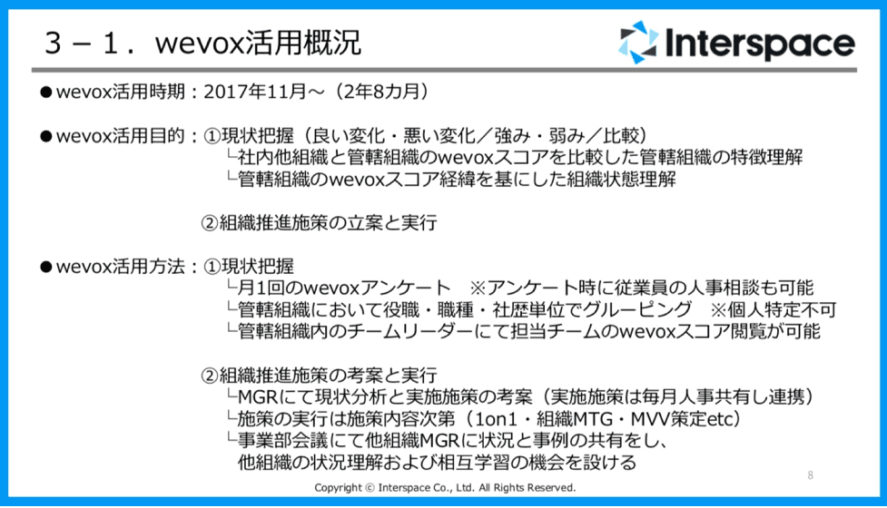 インタースペースではwevoxを3年ほど前から活用させてもらっています。活用目的は、組織の現状把握と把握した上での組織改善です。弊社では、月1回のwevoxのアンケート配信を行なっており、全従業員が回答しています。スコアの閲覧は、マネージャーは全社の各事業部、グループの閲覧ができ、リーダーはグループ内のチーム単位や役職・役割単位、メンバーは自分のスコアと所属組織全体の閲覧ができるようになっています。