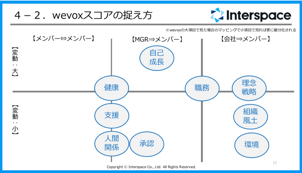 2つ目は、wevoxを始めてわかったのが、組織状態いわゆるエンゲージメントに影響を与える要素はとても多いということ。一概に「これが原因」と組織課題を特定できることは少ないので、組織推進における共通言語や共通優先度、定量基準を持つことは重要です。wevoxの項目は組織内での会話の際に共通言語として使えるのでありがたく、曖昧なモチベーションという表現を使うことが減りました。従業員のモチベーションはいろいろな要素が重なって成り立っていて、要素の重要度は人それぞれで、時期変動もあります。