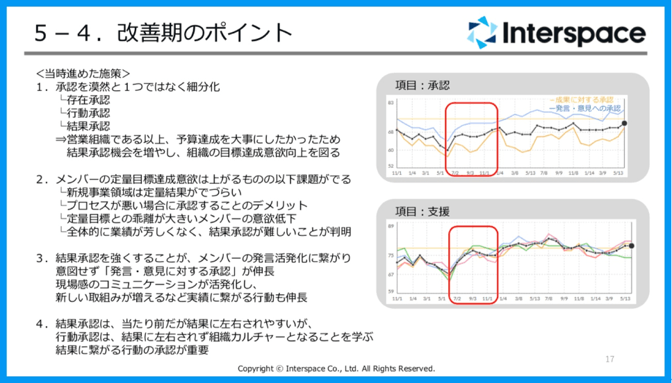 その結果、メンバーの予算達成意欲は上がりましたね。ただ、結果承認だけ大事にすると、その弊害として、新しいチャレンジをしていて、すぐ結果がでるわけではない領域にチャレンジしているメンバーが無下にされたり、未達メンバーがモチベーションを保ちづらいようなことが起こってしまいました。しかし、各管理職がメンバーと1on1を重ねていくうちに、結果を出すためのプロセスに対して支援する動きが出てきて、意図せず結果に繋がるプロセスや発言を承認する支援が増え、関連項目のスコアも上がってきました。