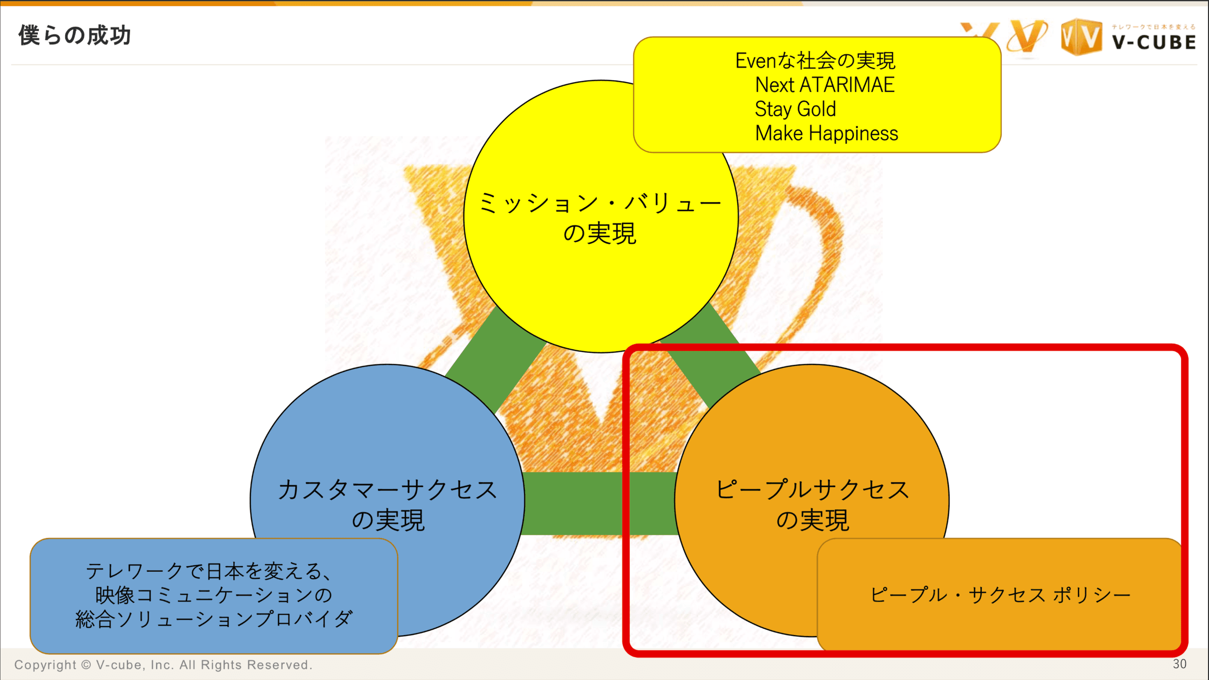 そしてこれら2つを支え、創り上げていくのはブイキューブの人たちであり、当然のことながらブイキューブの人たちの成功、即ち我々「ピープル・サクセスの実現」も忘れてはいけませんし、とことん追求していかなければいけません。この3つの実現のバランスが極めて大事であり、バランスを保ちながらハイレベルな状態にもっていくことが結果「僕らの成功」のレベルを上げていくものである、と私は考えています。