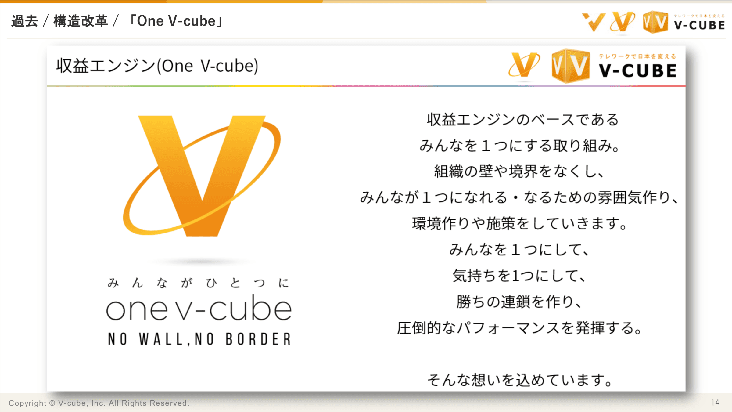 One V-cubeには、ものすごく簡単に申し上げますと「一致団結して頑張っていこう、僕らが一致団結するとものすごい力を生むから」という想いが込められています。構造改革を進めていく中で赤字体質の状態から、収益が見込めて自立歩行ができるようなキャッシュフローが生まれ始め、ここからもう一度浮上しよう、羽ばたこうという会社の状態になった2018年6月に、私から全社に向けて発表しました。