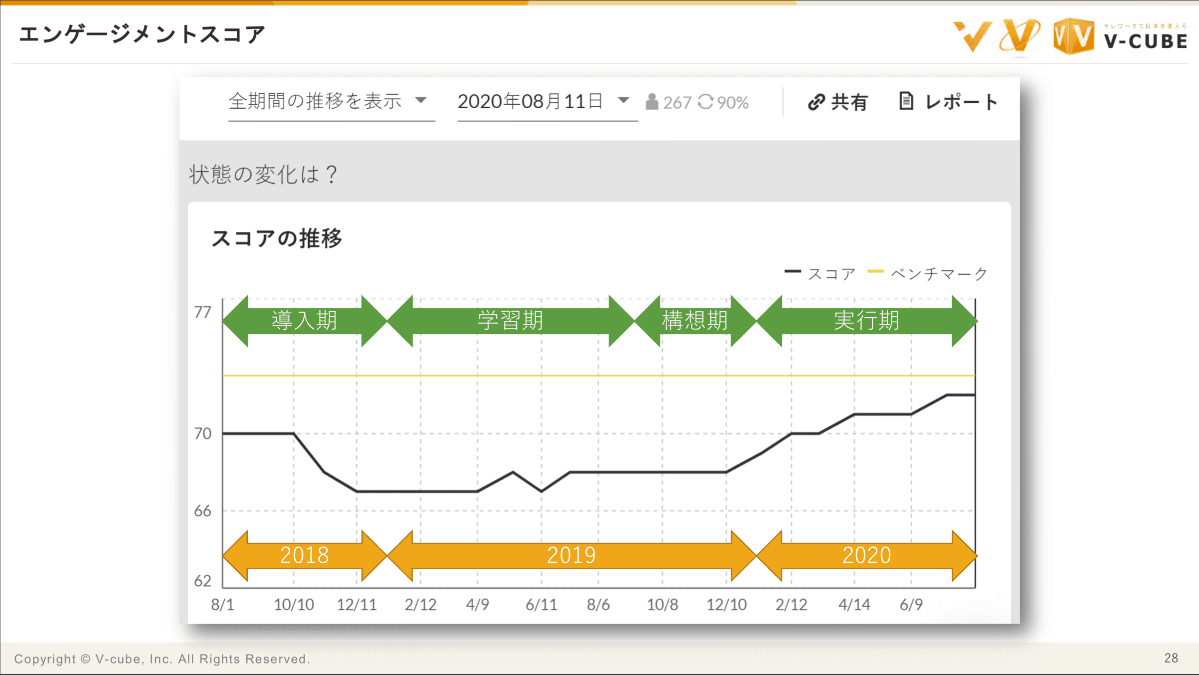 今回は、過去2年半の間の歴史と、それに対するエンゲージスコアの相関関係についてお話しさせていただきました。私からは以上です。ありがとうございました。