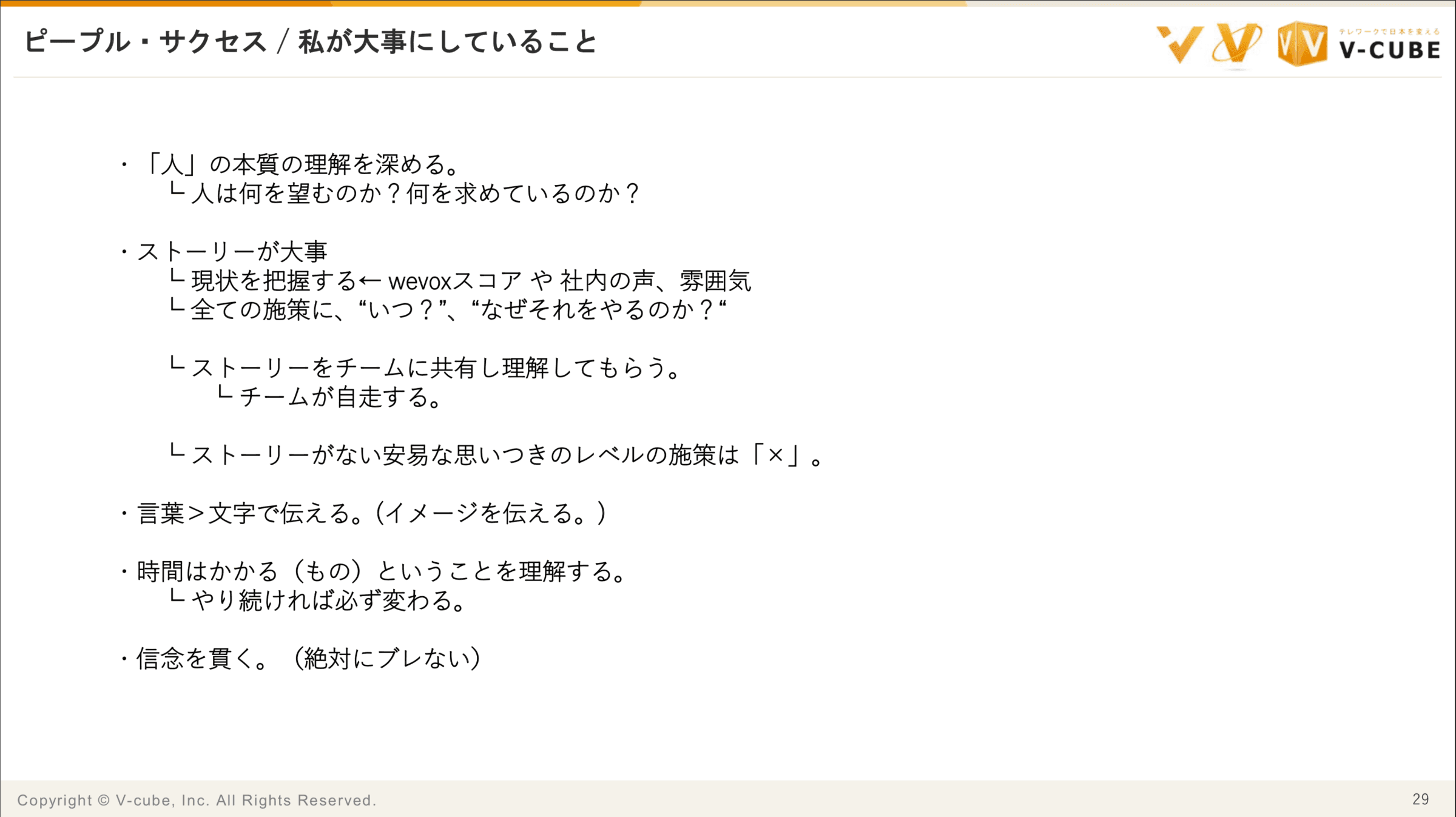 まだリリースされたばかりのものですので、時間をかけて社内に浸透させ、これからブイキューブに入社する社員たちに対しても強く求めていくことで、より強いOne V-cubeを作っていきたいと考えています。
