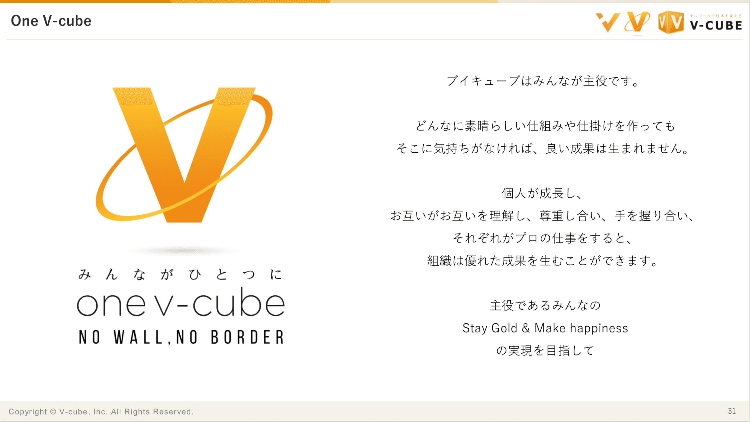 「Next ATARIMAE」次の当たり前とされる文化を作ることができる人財の育成。「Stay Gold, Make Happiness」個が輝けるための支援、また個の幸せ、周りの幸せの実現。そして「One V-cube」の実現です。
