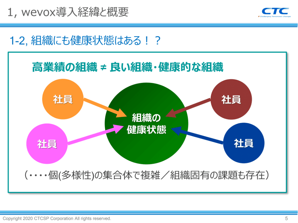 こんにちは、CTCエスピー株式会社の岡田です。今回は、弊社がどうしてwevoxを導入することになったのか、そして実際にどのように運用しているのかについて簡単にご説明し、その後、弊社で実行しているwevoxのサーベイと連動した取り組みや、今後の課題についてお話しします。
