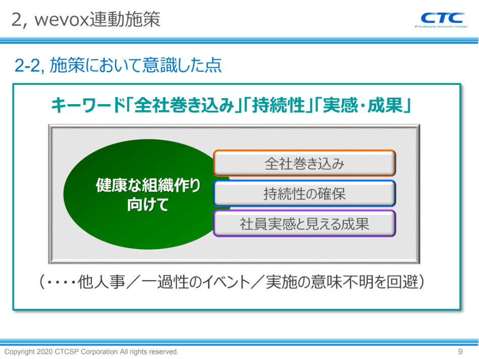 最後は「実感」してもらうことです。wevoxと連動した施策を行うことでスコアに変化が生まれ、スローガンや動画もできましたし、経営に自分達の声が届いたことにより細かい施策が実現できました。自分達の声により会社が動いてくれたと実感してもらうことは非常に重要だと考えていたので、この3点を意識しました。