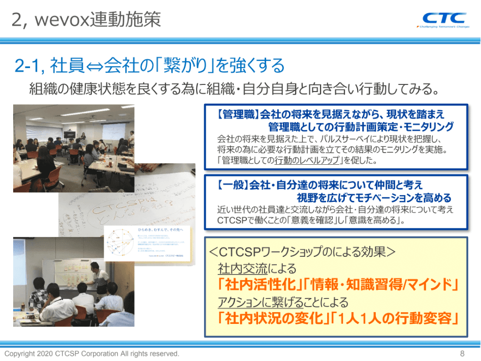 先ほどお話しした、社員の抱える思いについて深掘りすると、CTCエスピーという会社の位置付けのせいか「自分達は今後どうなっていくんだろう?」と見えない不安を抱えている社員が多く見られました。そこで、昨年度のwevoxの導入開始と同時に、一般社員と管理職、2つの階層にアプローチしてワークショップを開催したのです。