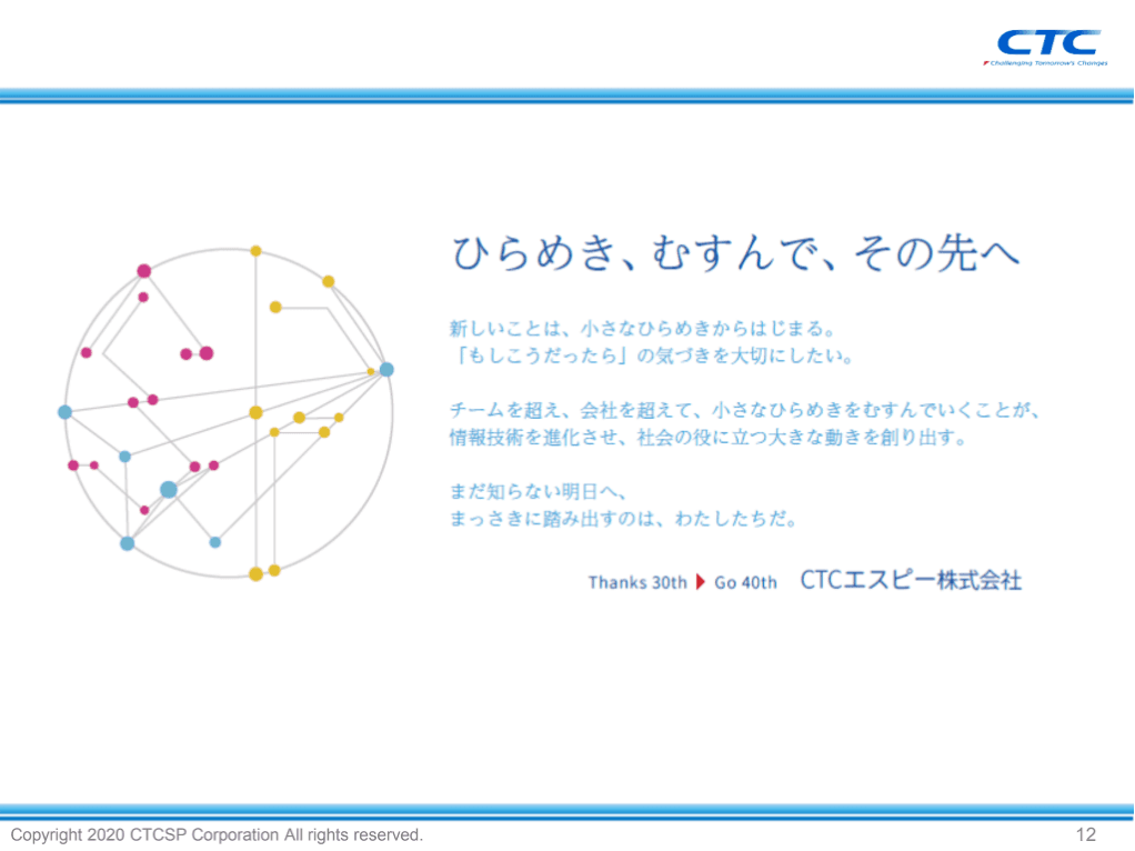あとは、行動変容です。「どんな小さなことでも、220人がやってみれば会社は変わる」と勇気付けながら、一緒に伴走しました。また、弊社が今年で創立30周年を迎えるにあたり、マーケティング部からインナーブランディングの改変提案があったため、今回のアウトプットとしてみんなが考えたものを形にするべく、スライド内のスローガン(ひらめき、むすんで、その先へ)や、プロモーション動画を作成しました。