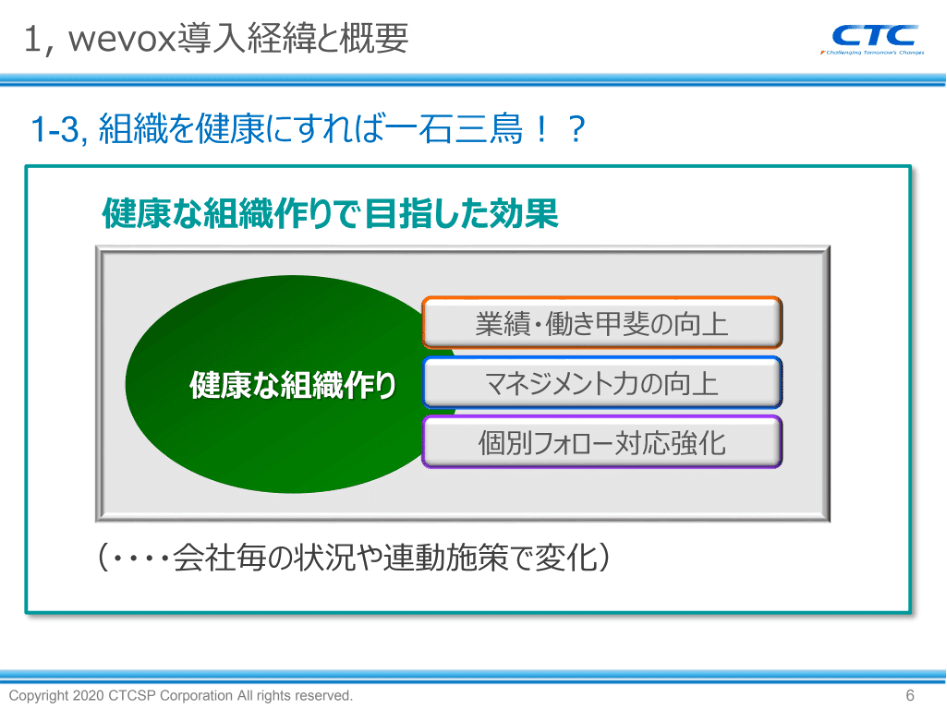 皆さんもご存知の通り、組織の状態はwevoxの9つのカテゴリー要素が複雑に絡まってできています。まずは、そうした組織の状態を把握するために、導入の一歩を踏み出しました。当然、会社としては投資になりますので、導入には「どういう効果を目指すのか」という問いが突き付けられました。私達が目指した効果は、下のスライドにある3点です。