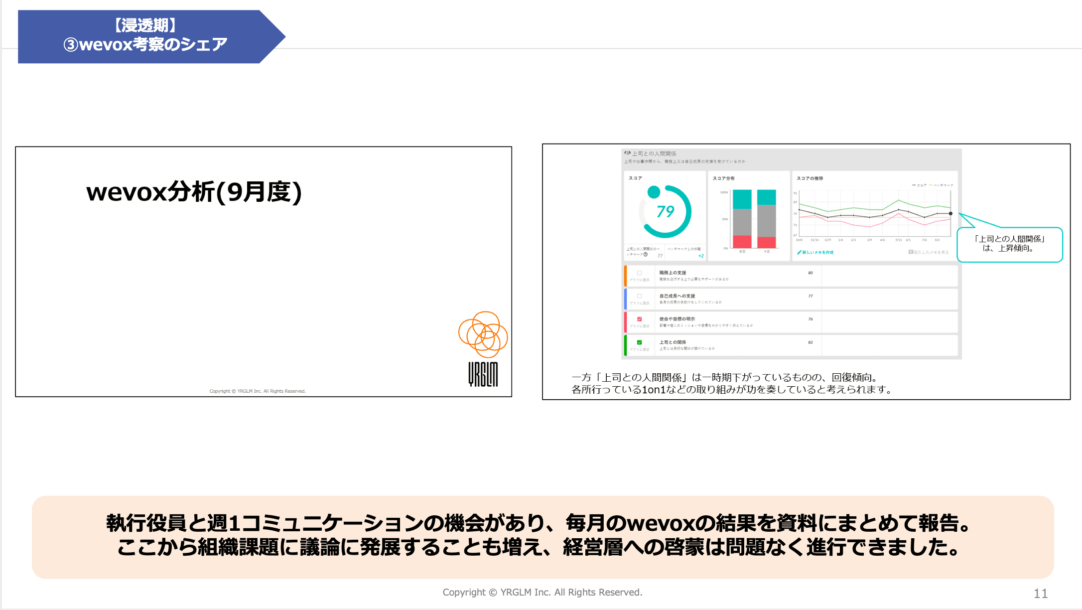 ここから施策に入っていくわけですが、まず着手したのは経営陣の取り込みです。部長よりも先に、経営層に対してwevoxが使えているとアピールすることで、課長や部長の層に落とし込みやすいと考えたからです。ですので、経営層にwevoxの分析結果を報告する時間を取るようにしました。元々、執行役員とは週1回のペースでコミュニケーションを取っていたので、wevoxの簡単な分析データを持ち込むようにしたんです。これによって、経営層にもwevoxを認知させることができますし、部長陣に施策を落としていくときも、私だけの判断ではなく、全社にwevoxが必要であるという説得力が生まれます。今後の施策をスムーズに進めるには欠かせないステップでした。以下のスライドの右側が、実際に私が作った資料ですが、このような簡単な内容のものを10ページ分ほど用意していました。