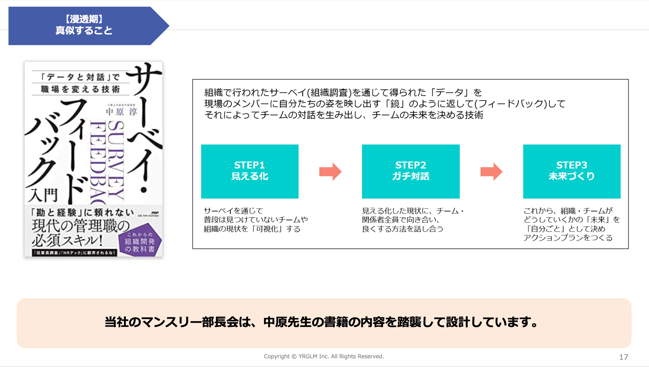このような浸透期を経て感じた4つのエッセンスがあります。1つ目は真似をすること、2つ目はキーマンを見つけること、3つ目は良いことに目を向けさせること、4つ目は決めようとしないことです。真似することに関しては、立教大学の中川教授の著書「サーベイ・フィードバック入門」を参考にしています。まずデータを提示して、ディスカッションをして解決策を見つけるという流れは、この本からヒントを得ました。