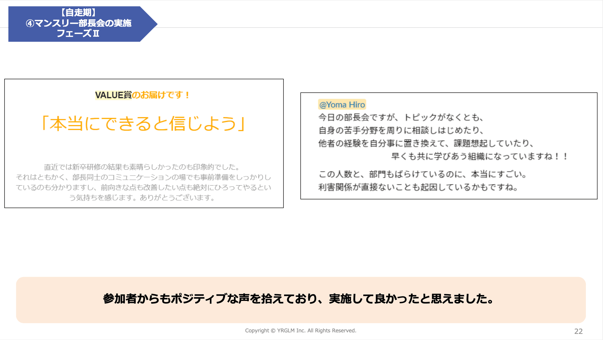 また、私から部長に依頼をし、事前に用意してもらった成功事例を共有してもらうという時間も設けました。ここでは、私がwevoxを分析して、スコアが上がっている部署の部長にその傾向を伝え、この要因を共有してもらうように伝えました。これによって、部長同士が自分達のスコアを目に向けてくれたり、資料にまとめてくれたりと、お互いの参考になる会が実現できるようになったと思います。