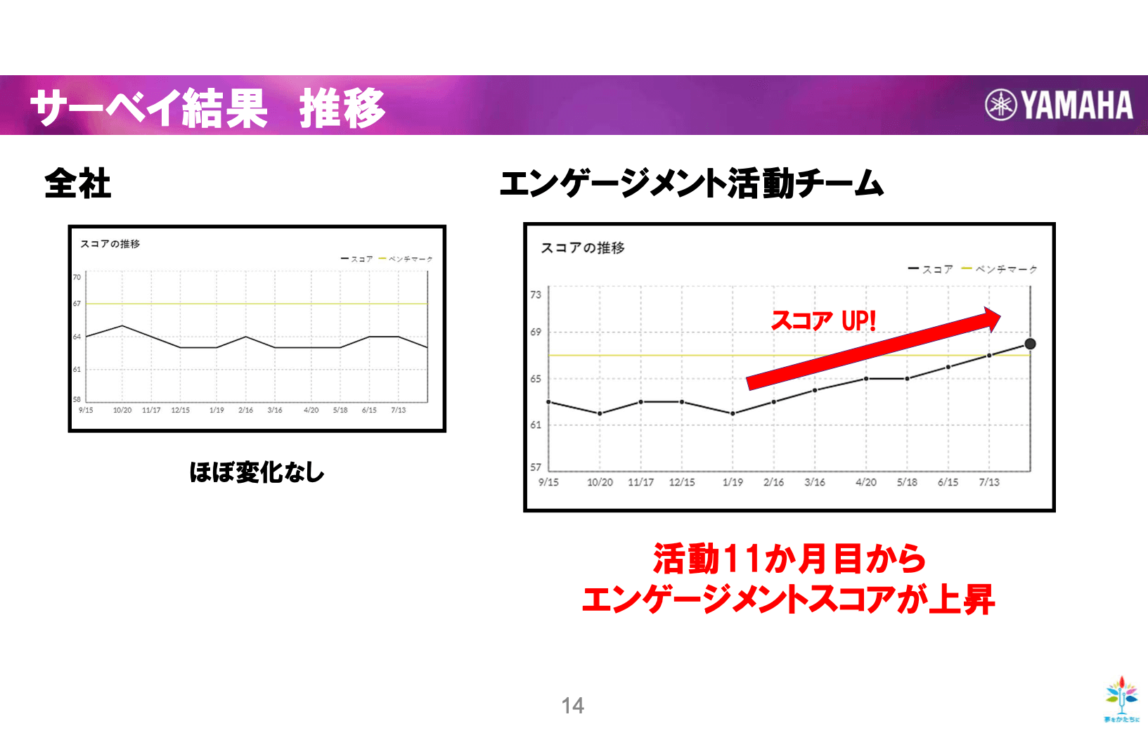 左が全社の結果ですが、Wevox導入当時からほぼ変化がありません。しかし、私が現場に入り込んで一緒に活動しているチームでは、活動をリスタートしてから11ヶ月目あたりからエンゲージメントが上昇し続けています。Wevox導入から数えると、約2年でようやくスコアに変化が現れ始めたと言えます。