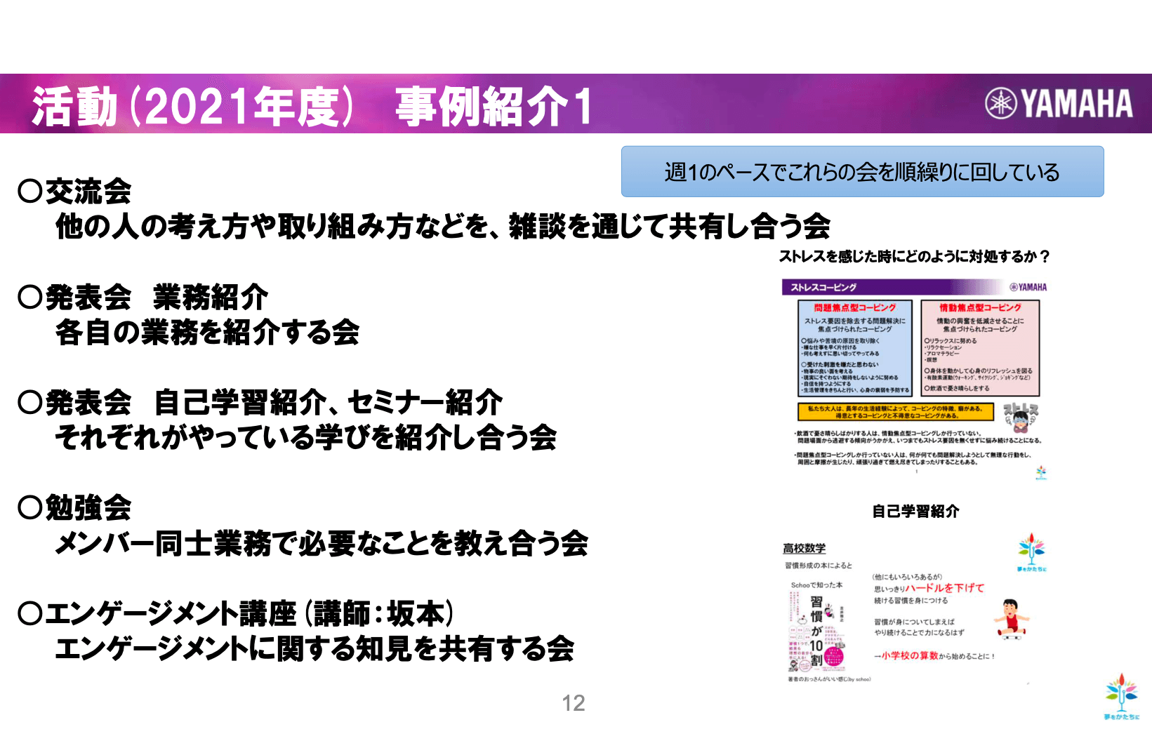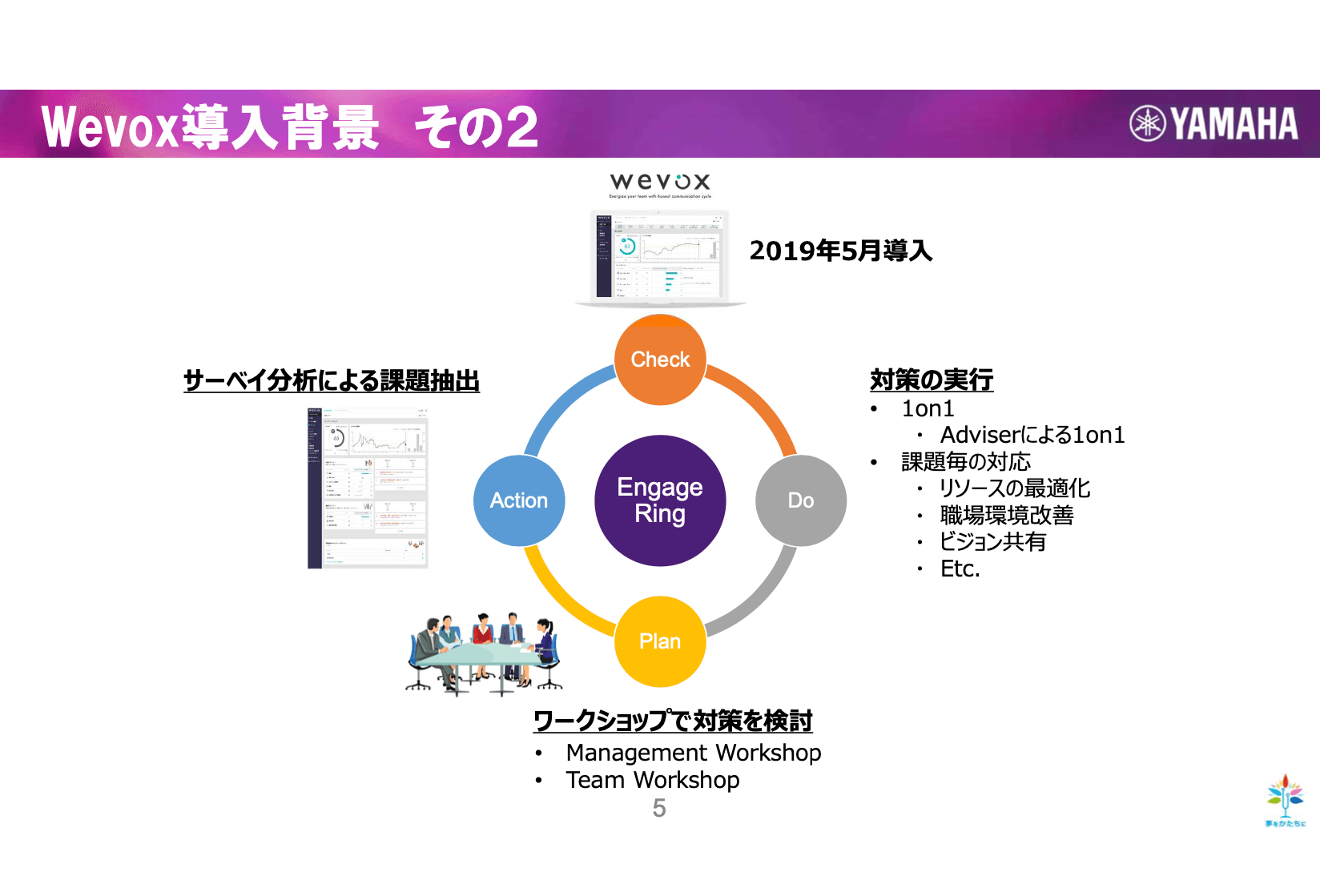 ありがとうございます。ヤマハハイテックデザインの坂本と申します。ヤマハグループの製品開発を担う弊社では、楽器・音響製品、FA機器の開発に携わっております。本社は静岡県磐田市、社員は50名程度です。弊社でエンゲージメント活動が始まったきっかけは、前社長からの「エンゲージメント活動の推進役をやってみないか?」という言葉でした。弊社では、職場におけるエンゲージメントを向上させるPDCA活動を「エンゲージリング活動」と呼んでいます。エンゲージリングは婚約指輪を意味するので、夫婦関係のように会社と社員が対等なパートナーとして絆を強くできるよう、社長が命名しました。そして、このPDCAサイクルを回すため、2019年5月にWevoxを導入しました。