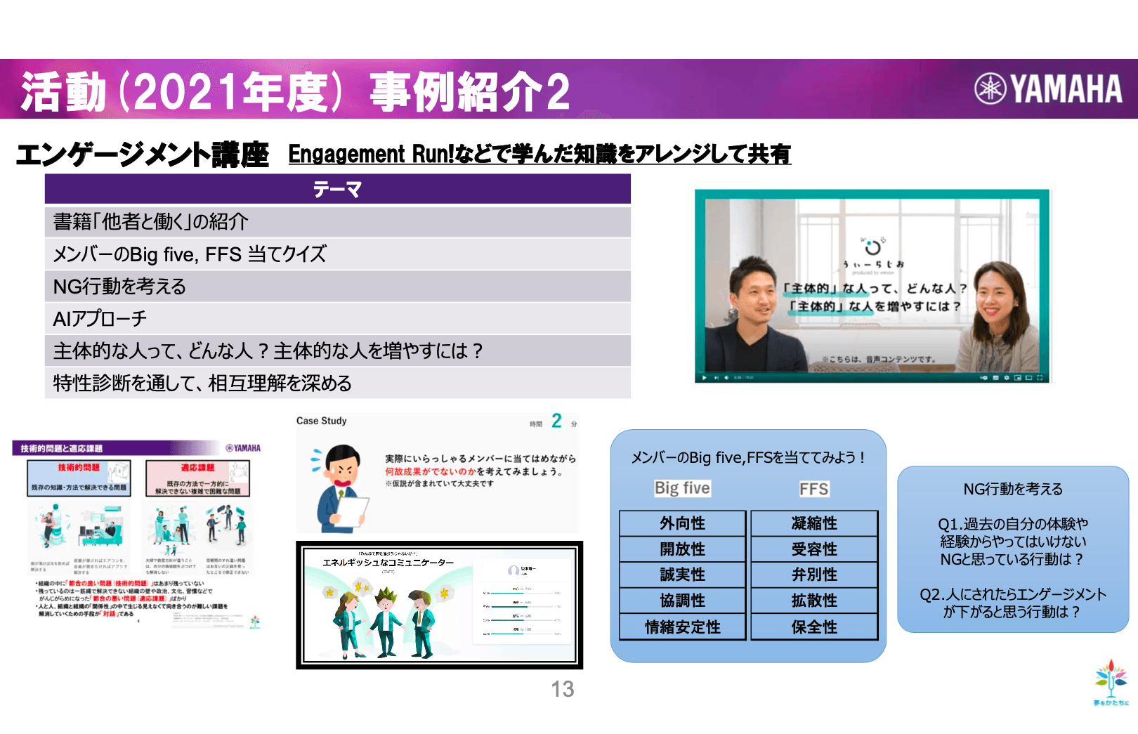 各テーマによって仕切り役は異なりますが、私が担当しているエンゲージメント講座では、Wevoxが運営するオンラインアカデミー「Engagement Run!」 などで学んだ知識を少しアレンジして共有しています。実は、Wevoxの平木さんのラジオ「Weradio」も活用させていただいているんですよ。主体性について説明する際に、このラジオを聴いてもらうところから始めたのですが、メンバーがリラックスし、楽しんで会に入ってもらうことができました。他にも、書籍の紹介や、メンバーのBig five・FFS当てクイズ、NG行動を考える、AIアプローチ、特性診断を通して相互理解を深めるなどといったテーマを取り上げています。