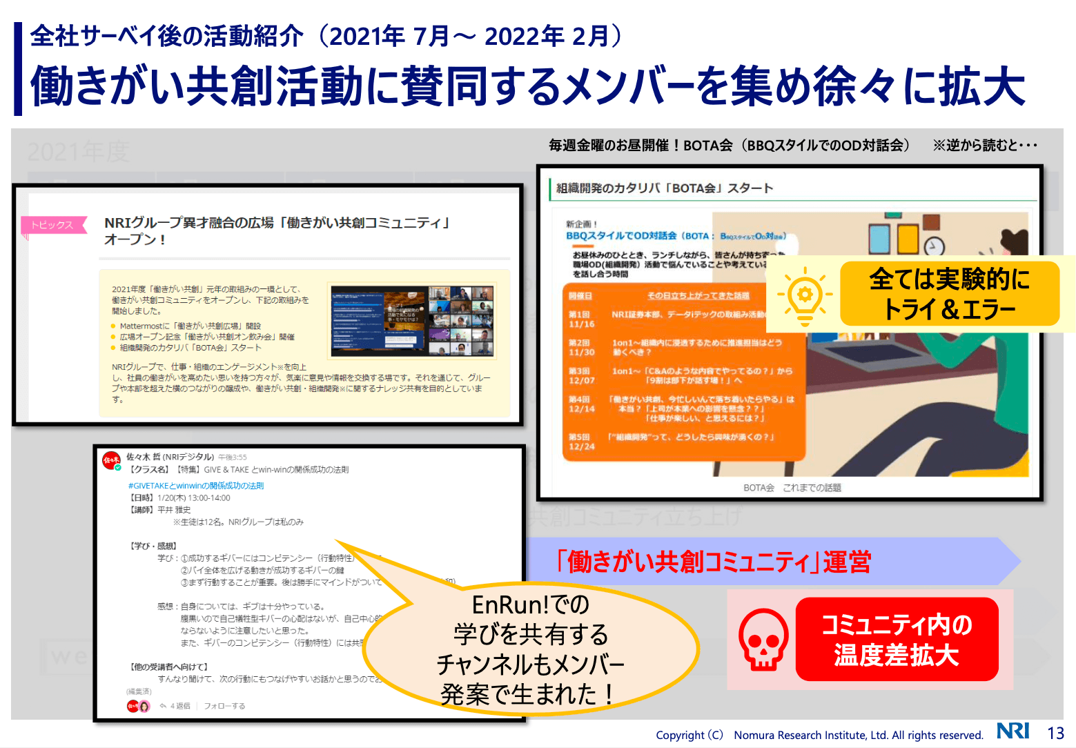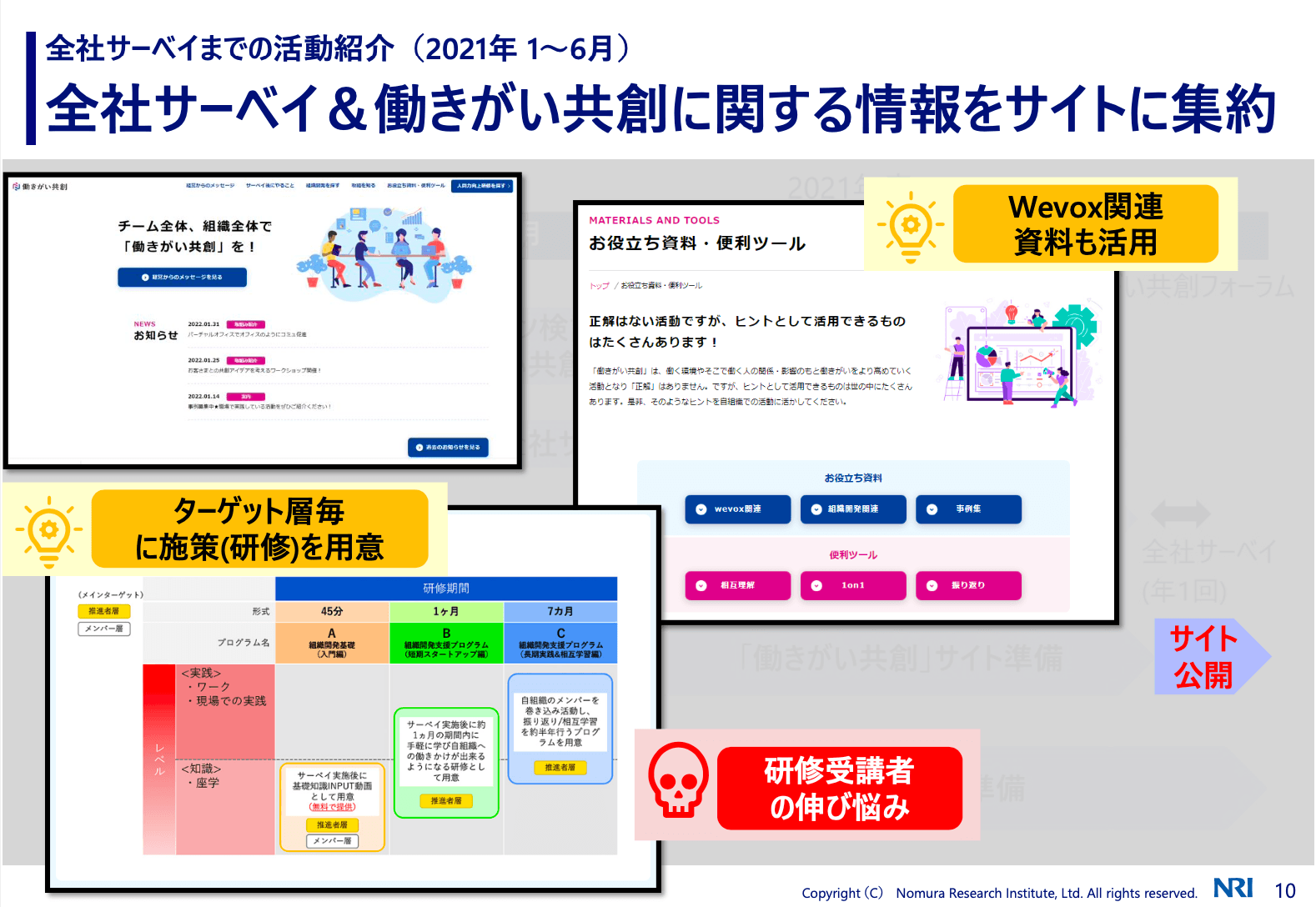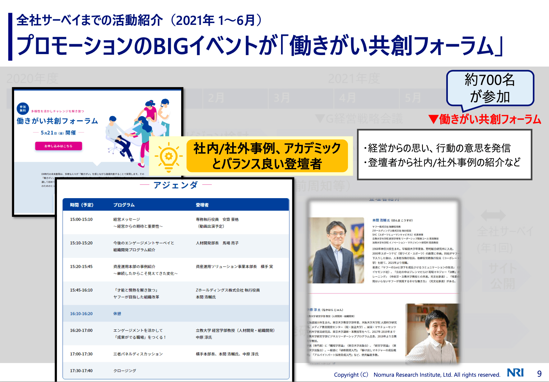 これはかなりビッグなイベントになり、オンラインで総勢700人が参加しました。NRI単体の人数は7000人数弱なので実際の参加者は約1割。ちょっと悲しいですが、必須としていないイベントの参加人数としては多い方なのではと私たち企画側は感じています。このイベントにおける良かった点は、社内外から登壇していただいた方のバランスが非常に良かったことです。社内で私が元々いた事業本部の本部長に、どうして本部でWevoxを活用することになったのか、使ってみての感想を事例として紹介していただいたり、NRI出身・現Zホールディングスの本間さんにヤフー時代の取り組みをご紹介いただいたりしました。また、組織開発については、私たちチームメンバーが授業を受けた卒業生ということもあり、立教大学の中原先生にもご登壇いただきました。