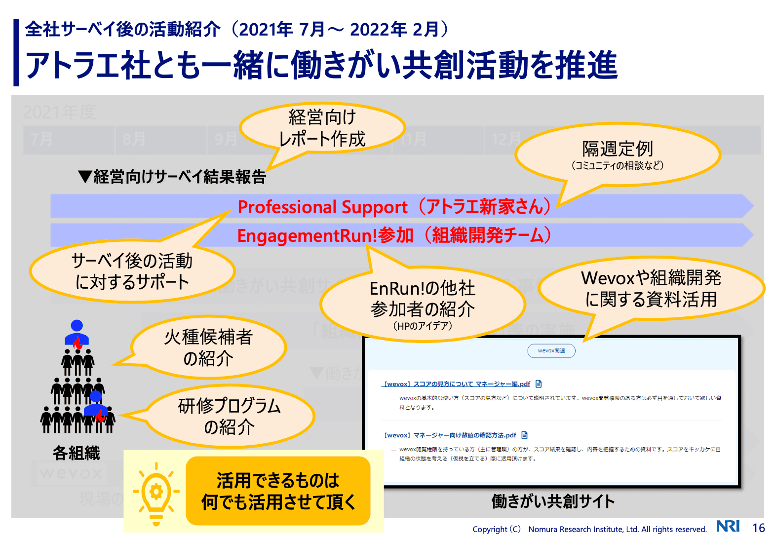 自分たちのやっている活動について、本当にこれがいいのかと悩む方も多いのではないでしょうか。私自身、エンゲージメント活動を高めていくことに関しては、競合はないと考えています。ですから、ぜひこういう場も含めて、社会のコミュニティを構成する一員として一緒に盛り上げられたら嬉しいです。先ほどお伝えしたとおり、自分たちだけでやったのではなく、Wevoxのみなさんや他の会社さんのアドバイスがあってできていることですから、そういったコミュニティを盛り上げていければと思います。引き続きよろしくお願いいたします。