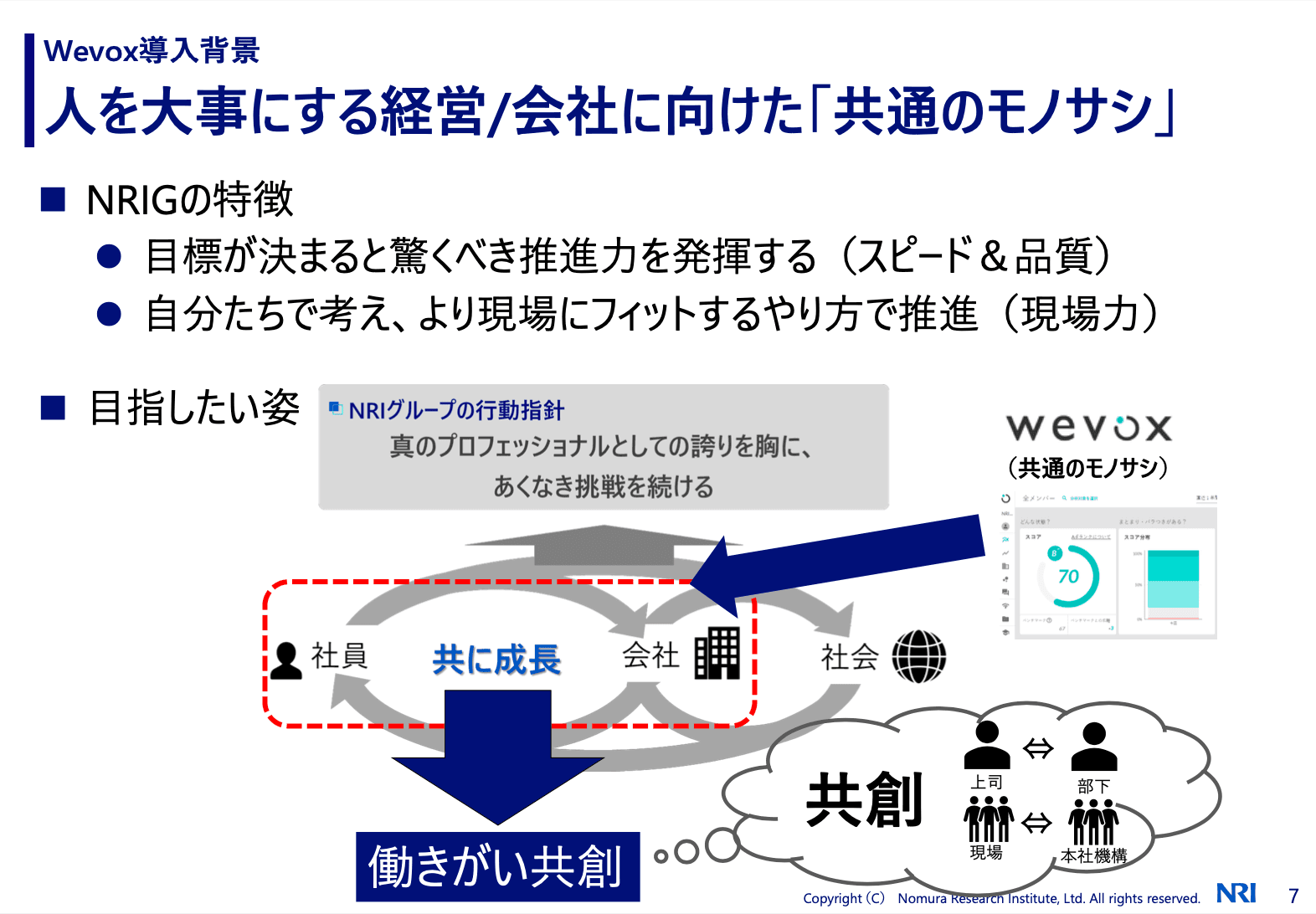 NRIグループの強みは、目標が決まると推進力を発揮してきちんと期限を守ってやりきるという点です。もちろん品質にもこだわっていますが、先ほどの組織構成の中で事業本部ごとに工夫しており、現場力がかなり強いという特徴があります。また、目指したい姿はNRIグループの行動指針でもある「真のプロフェッショナルとして誇りを胸に、あくなき挑戦を続ける」です。そして、上のスライドにあるように、最終的には社会に価値を提供していくことをミッションとして置いています。当然、そのために主役となるのは社員であり、社員が成長していく場は会社です。この社員と会社の部分にフォーカスを当てて強化していく活動が必要なのではという流れの中で、話に上がったのがWevoxです。実はもともと私がいた事業本部で活用した経験があり、その活動実績が評価され、かつWevoxが弊社の目指したい方向には効果的と判断し、2020年11月に全社でのWevox導入を決定しました。