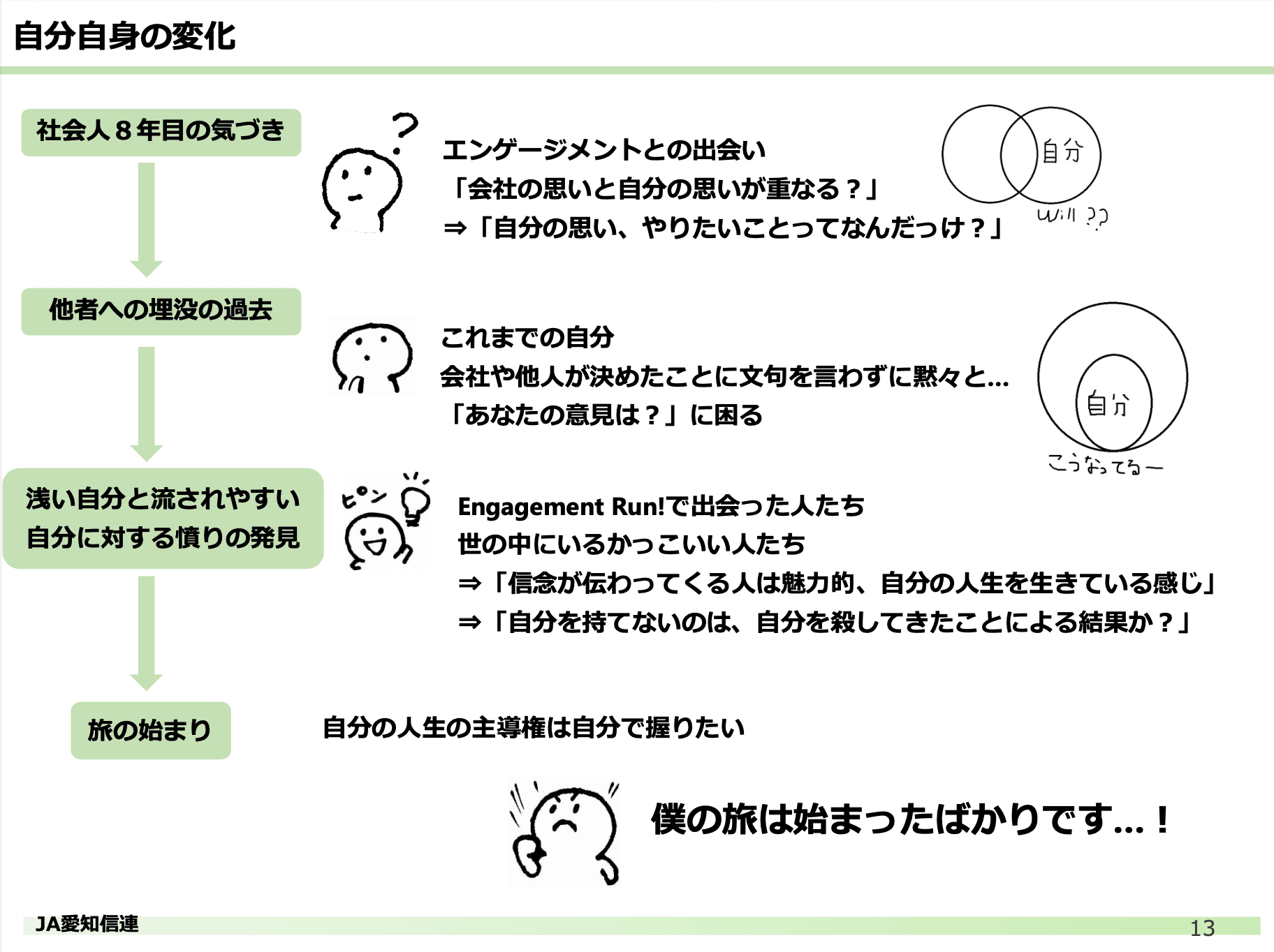 最後に、エンゲージメントの推進活動の中で生まれた私自身の心境の変化について少しお話をさせていただきたいのですが、エンゲージメントという考え方に出会った当初は、「会社の想いと自分の想いが重なるってどういうこと?」「自分のやりたいことって一体何だろう?」と疑問に思っていました。