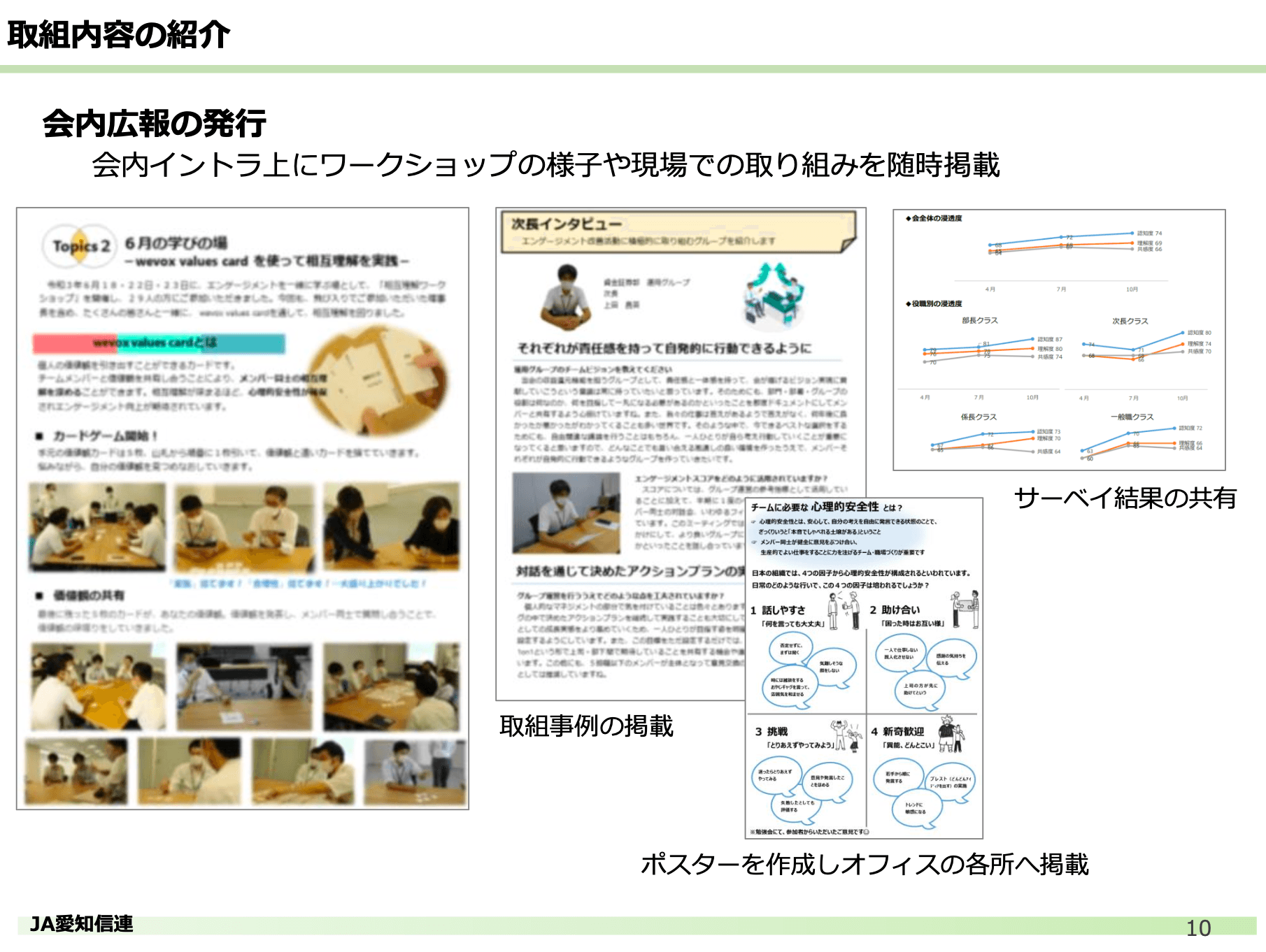 また、これに合わせて組織活性化につながる施策を随時展開し、取り組みをより多くの職員に知ってもらうために会内広報を発信しています。広報は、学びの場の様子の掲載はもちろん、現場の取り組み事例の紹介や、サーベイ結果の共有などにも使用しています。この1年は特に浸透強化期間ということもありましたので、啓発ポスターを作ってオフィスに掲示したりもしました。