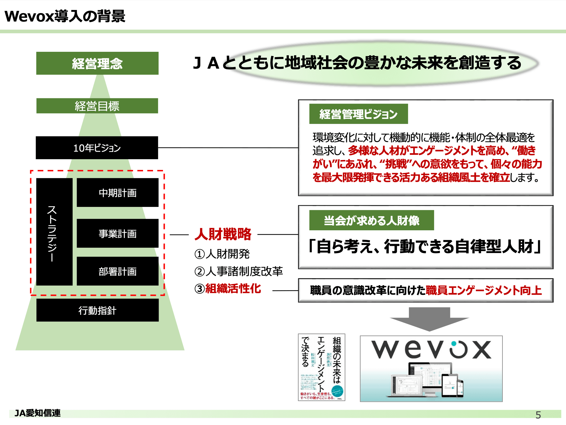 ツールの選定にあたっては、書籍「組織の未来はエンゲージメントで決まる」で学び、また、トライアル中の早い段階で「Wevoxっていいね」と感じたということもあり、結果的にWevoxを導入させていただくことになりました。