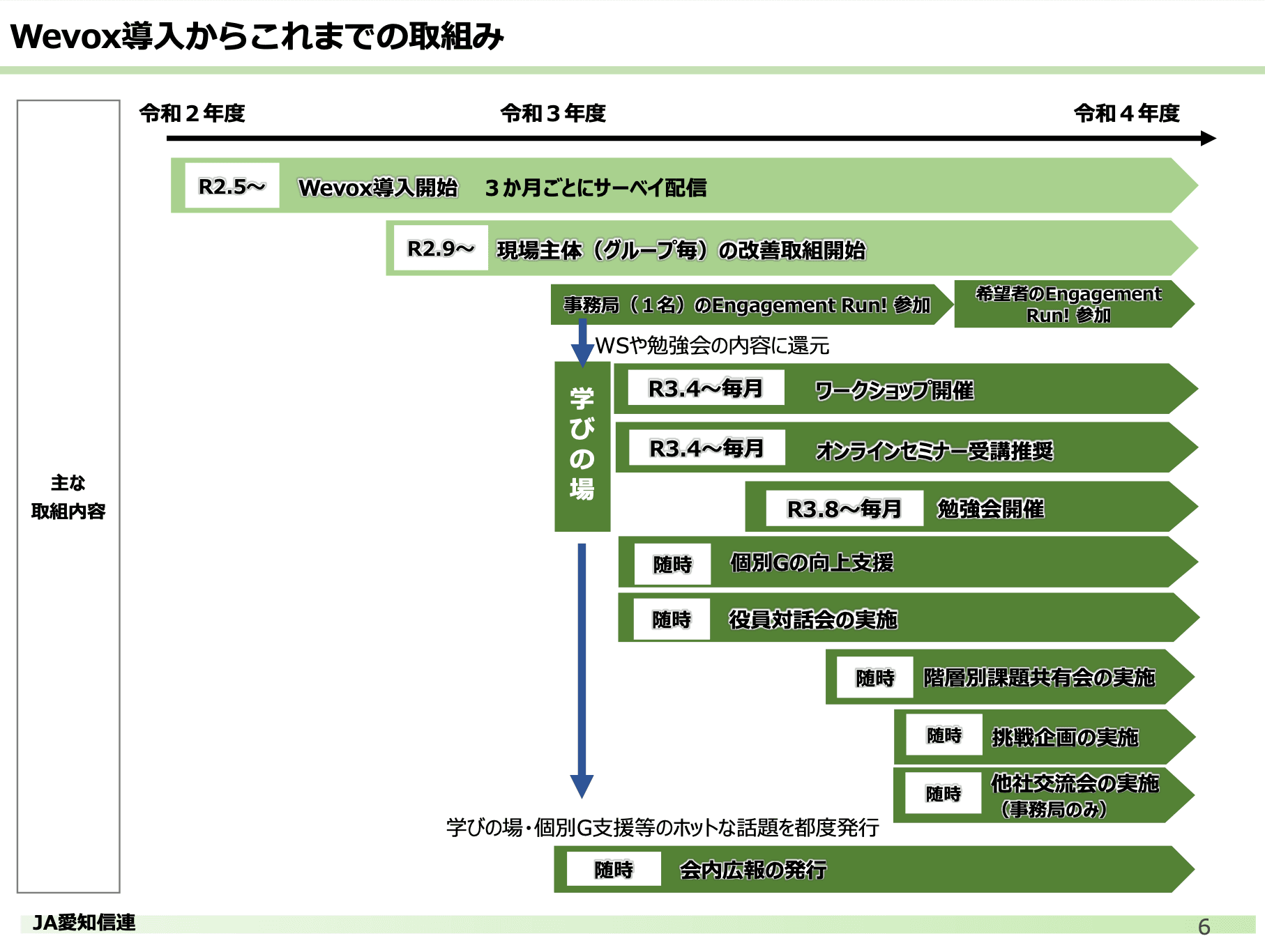 このスライドは、令和2年度から令和3年度にかけて取り組んできた内容を示したものです。Wevoxは令和2年5月から導入し、3ヶ月毎にサーベイを配信しています。導入当初のエンゲージメントの状態については、部署やグループ毎で様々でした。全社的なアプローチではなかなか届きづらい部分もあるのではということで、それなら現場主体で改善活動を進めてもらおうと、マネージャーが自チームのスコアを見られるようにしました。さらに、フィードバックミーティングでのスコアを題材にした対話を通じて、チームの改善を進める方法を促してきました。
