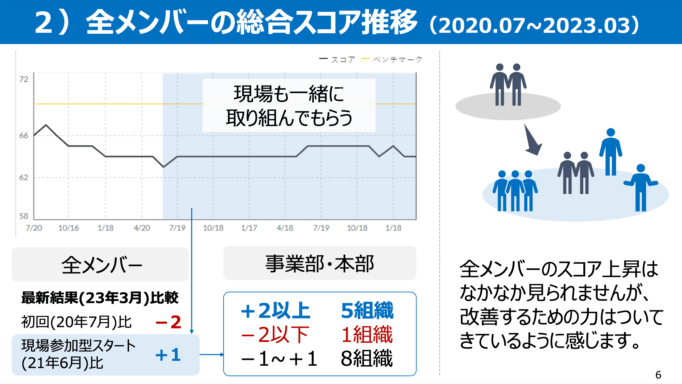 2021年6月と2023年3月(発表時の最新結果)のエンゲージメントスコアを比べてみると+1です。事業部・本部単位のスコア推移を見てみると+2以上の変化があった組織が5つ、マイナス2以下だった組織が1つでした。向上している組織が増えてきているのが、ポジティブな傾向であると捉えています。数値以外の部分でも、改善に向けて一緒に取り組んでくれる人が増えているなと感じており、スコアに大きな上昇が見られていないものの、改善するための力がついてきている印象です。
