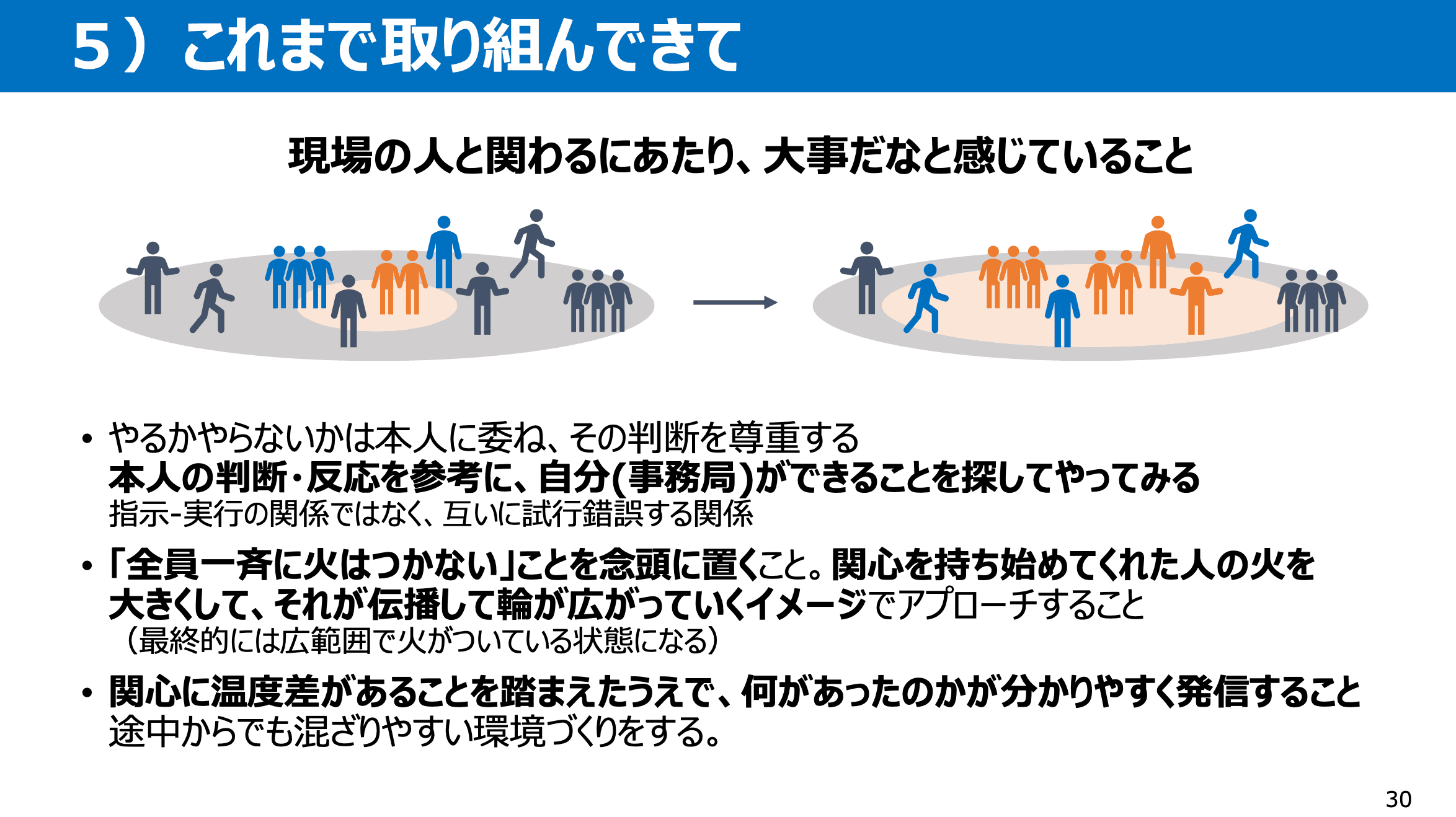 今回のウェビナーのテーマについて、個人的に大事だなと感じているのは自分ができることを探してやってみること、全員一斉に火がつかないことを念頭に置くこと、途中からでも参加しやすい環境にすることの3点です。