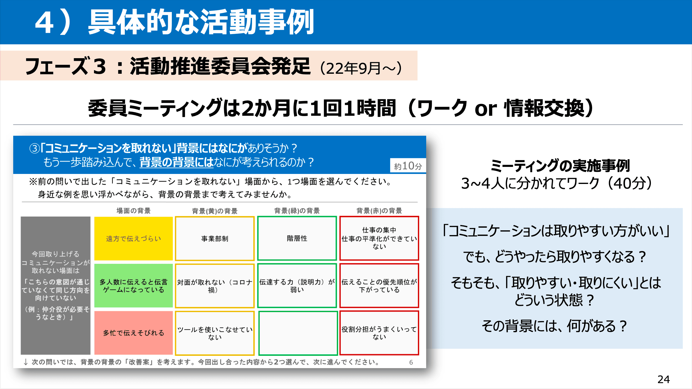 委員ミーティングは2ヶ月に1回開催し、その時の忙しさによってワークを行うか情報交換の場とするかを決めています。ここに載せている画像は実際に使ったワーク資料でして、コミュニケーションの取りやすさをテーマに3・4人に分かれて意見交換を行いました。オンラインでも行いやすいワークの進め方やワーク資料の作り方については、Engagement Run! Academyで経験したワークを参考に、自分たちがやりたいテーマに合わせてちょっと変更していました。