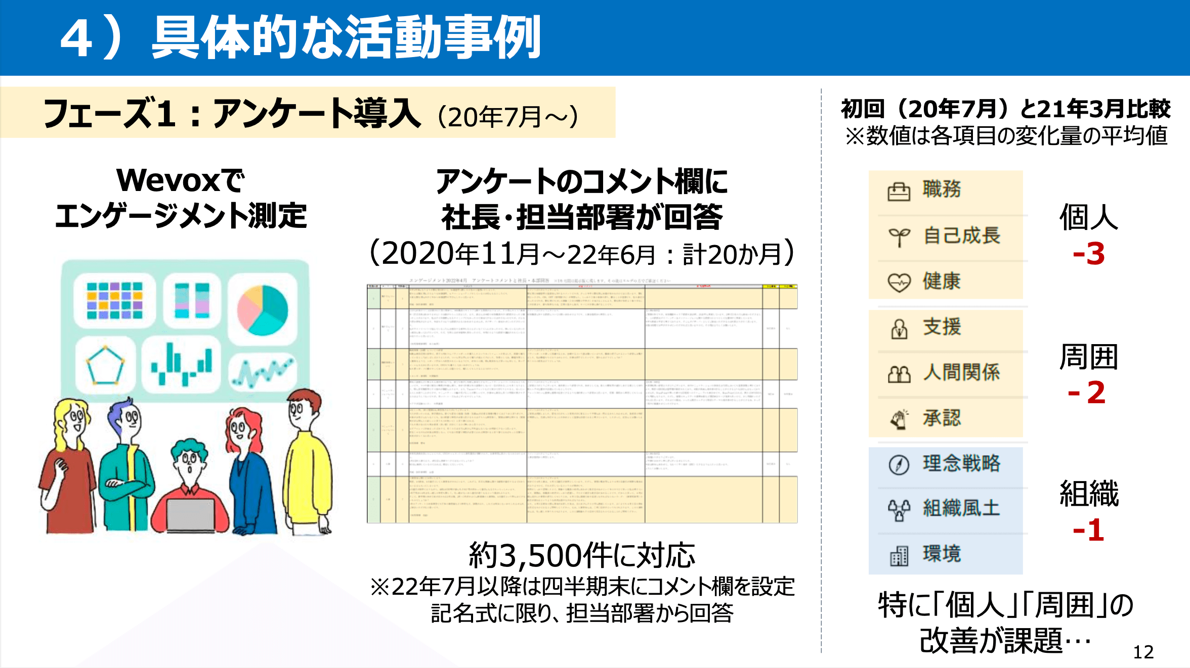 まずはアンケートの導入です。アンケートを導入してから最初の1年間は、アンケートを取り、アンケートの最後に設けたコメント欄に寄せられたコメントに社長と担当部署が回答するといった活動をしていました。ですが、フェーズ1では思うようにスコアが改善しませんでした。Wevoxのエンゲージメント測定はこの右側にある9項目ごとに測定されていまして、この9項目がエンゲージメント向上に必要な要素だろうと考えられています。これを上から3項目ずつ「個人・周囲・組織」に分類し、始めてから3月までのスコア推移に注目してみると個人と周囲が大きく下がっており、ここの改善が必要だということがわかりました。