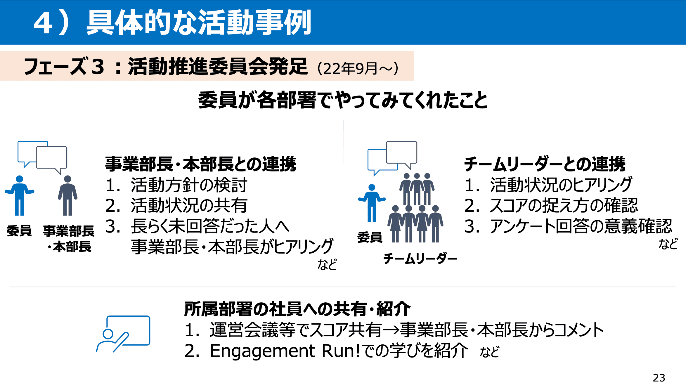 委員によって異なりますが、上のスライドにあるように、事業部長と活動方針を検討したり、チームリーダーに活動状況をヒアリングしたり、Engagement Run! Academyを受講して得た学びを社内に共有してもらうなどしました。