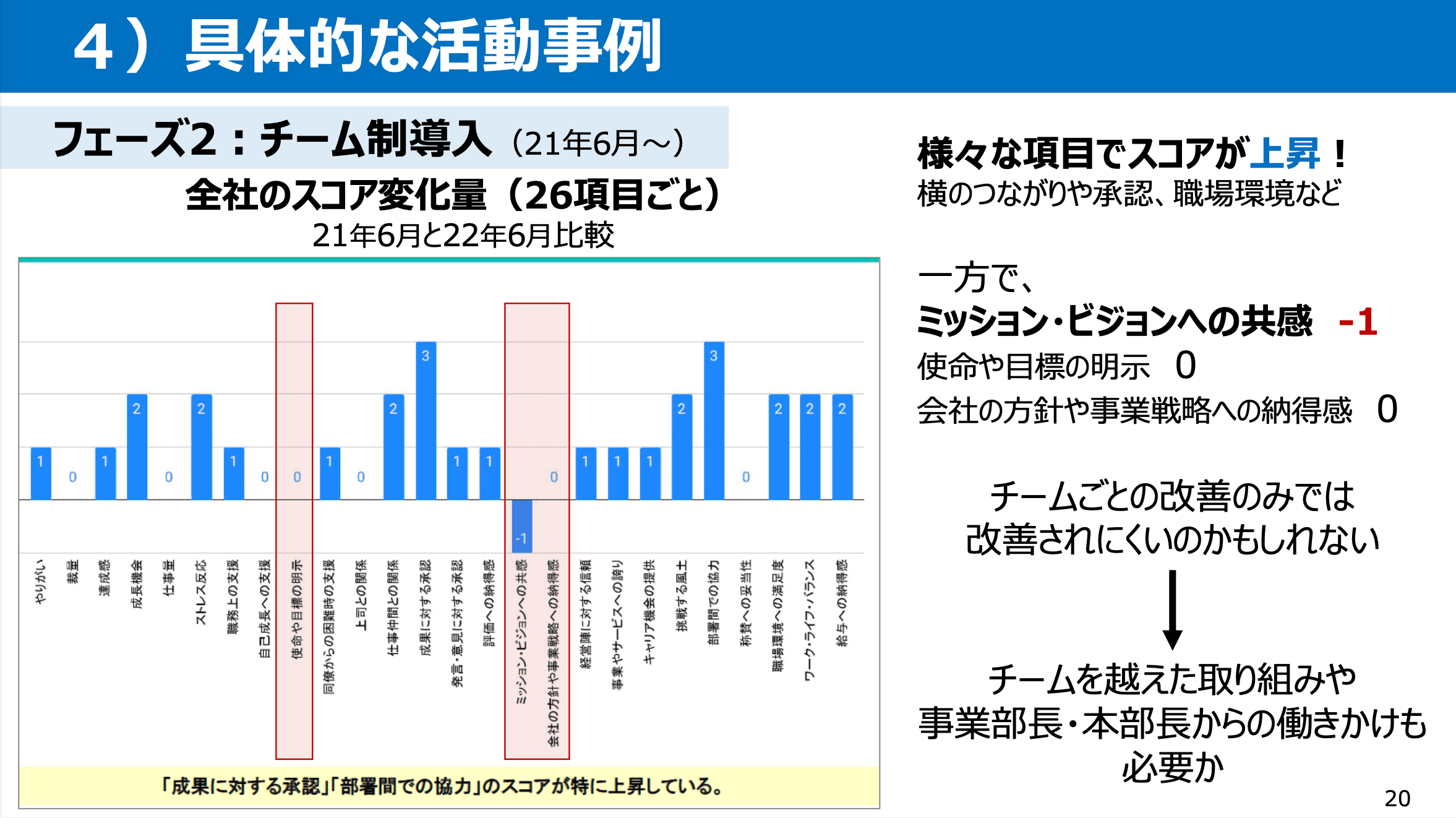 チーム制を導入した時のスコアと1年経った時のスコアを比較してみると、様々な項目で変化が見られました。横のつながりや承認、職場環境の改善という組織全体に関わる項目が上昇しています。横のつながりや承認はチーム制導入による成果かと思いますが、職場環境の改善については、フェーズ1で行った社長と担当部署によるコメントへの回答の成果がここに現れているのかなと感じています。一方で、ミッション・ビジョンへの共感がマイナス1で、会社の方針や事業戦略への納得感にも変化はありませんでした。