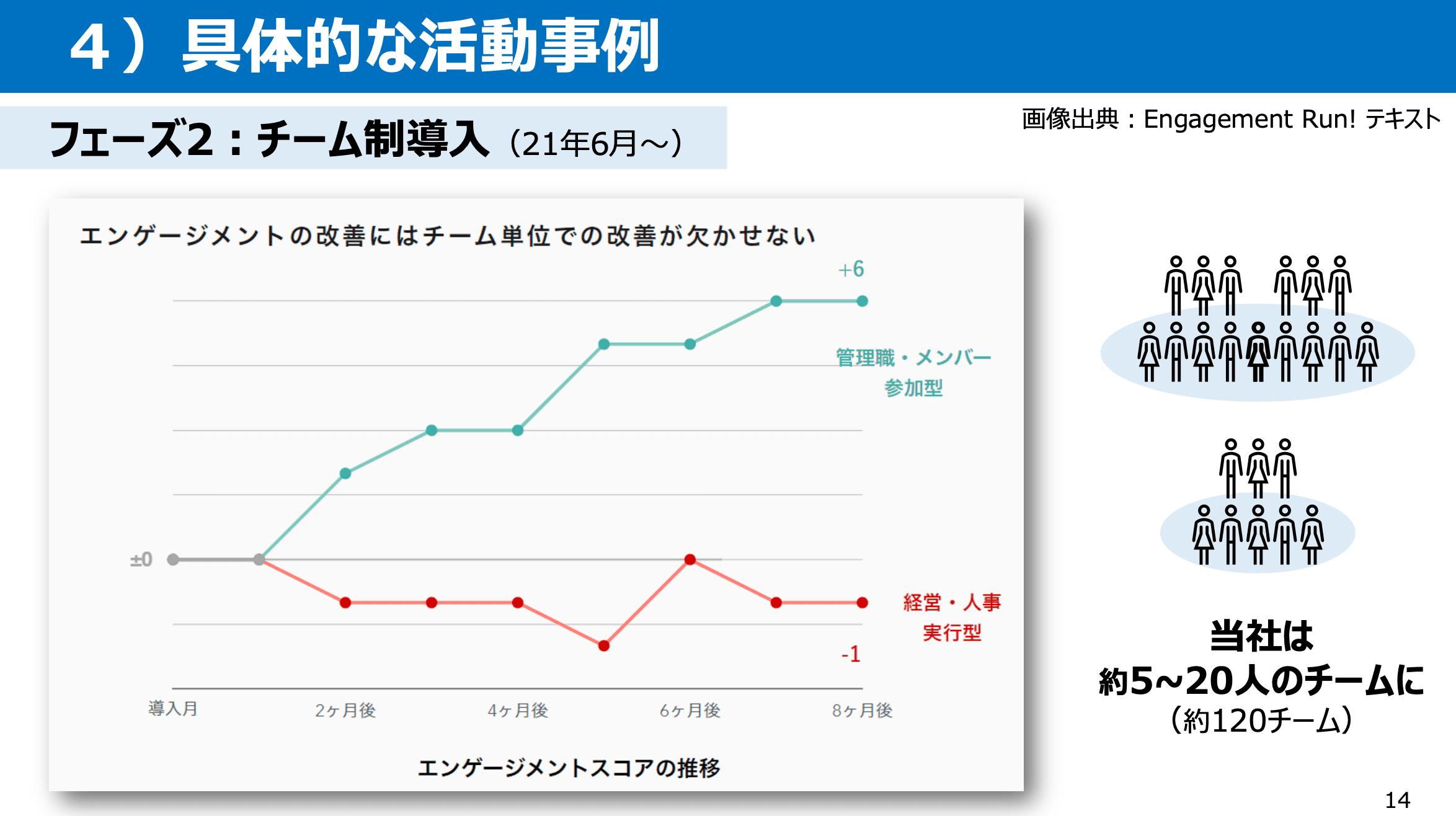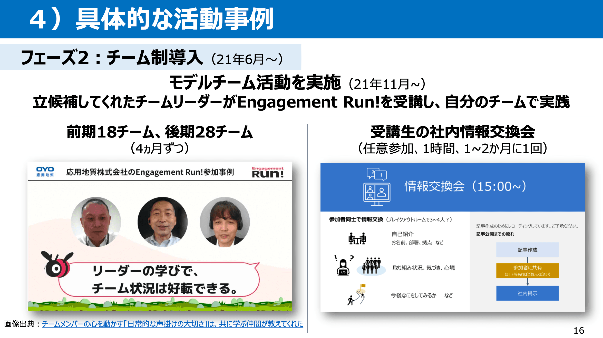さらに、受講生同士が社内で情報交換しやすいようにということで、1〜2ヶ月に1回、1時間話せる場を設けました。また、モデルチームはEngagement Run! Academyで活動方法を学べますが、それ以外のチームリーダーは初回の4回のトレーニングの後、社内に相談できる場がなくなってしまいます。そのため、毎月第3金曜日にエンゲージメント相談会を開催していました。相談会にはEngagement Run!の平井さんとカスタマーサクセスの清水さんにご参加いただきまして、弊社の参加者のお悩み相談や意見交換にご協力いただきました。相談会の内容はPowerPointにまとめて社内で共有するようにしていました。また、教えてもらったチーム単位の活動事例を横展開に繋げてもらえるよう社内報で紹介しています。