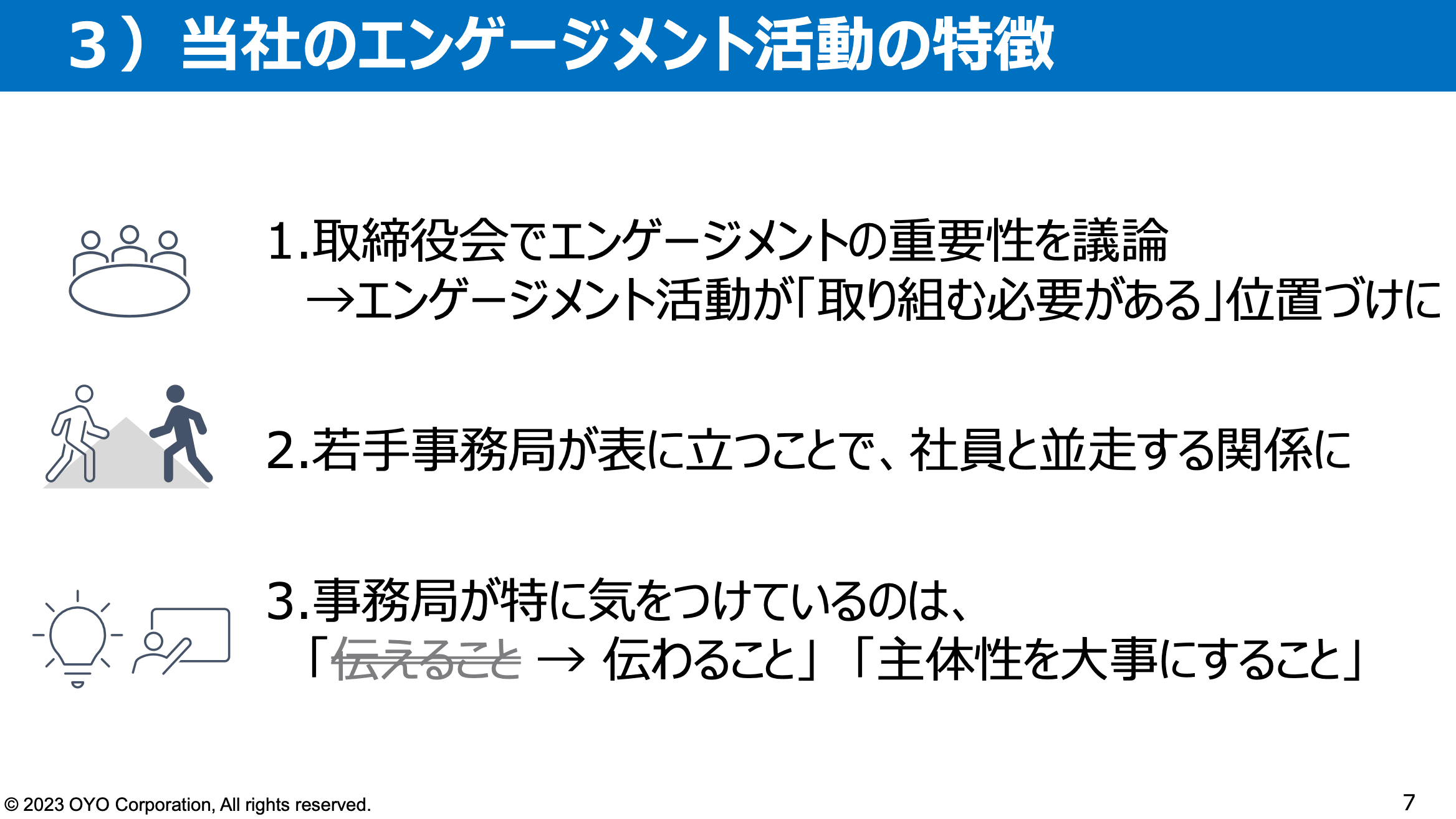 少し話の毛色が変わるのですが、経営層へは定期的に活動の報告をしており、経営層に活動を認知してもらうことで、会社が目指す方向や、やってほしいことのすり合わせを行っています。また、株主通信や統合報告書でもエンゲージメント活動を取り上げて、今こういう取り組みをやっています、ちゃんとやっていますよというのを投資家の方や株主の方にも見えるようにしています。