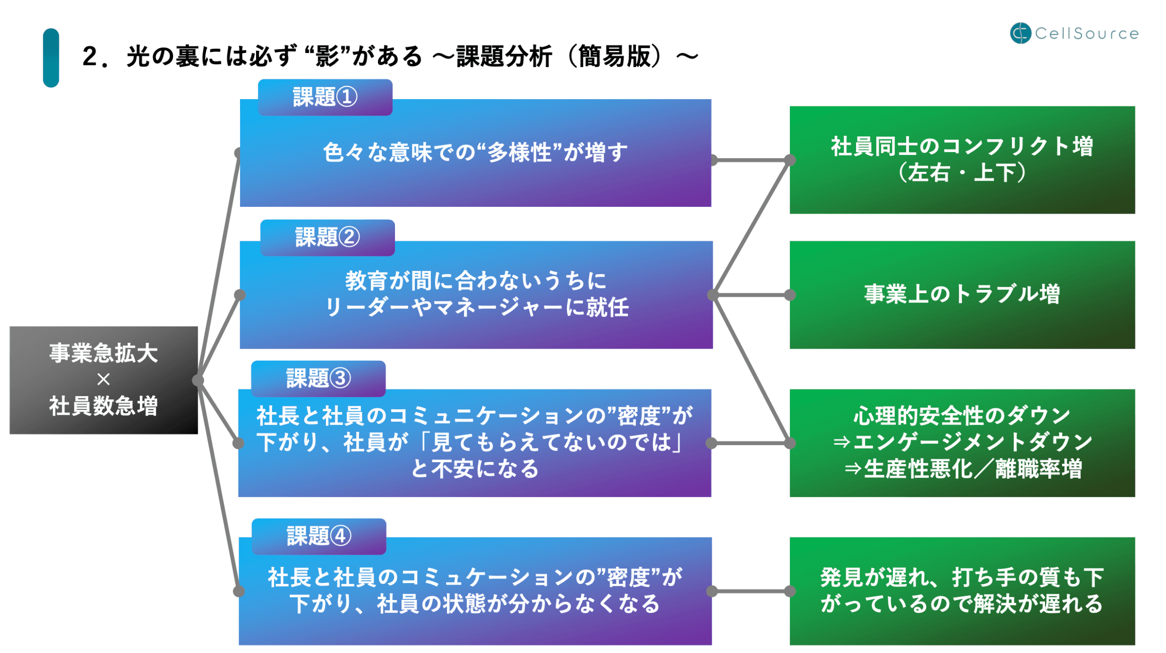 1つ目の課題が、色々な意味での多様性が増すことです。年次や能力など、ありとあらゆる違いがある人たちの人数が増えているため、左右・上下・斜めのいろんな形でのコンフリクトが発生します。それは人とのトラブルだけでなく、事業上のトラブルにも発展します。