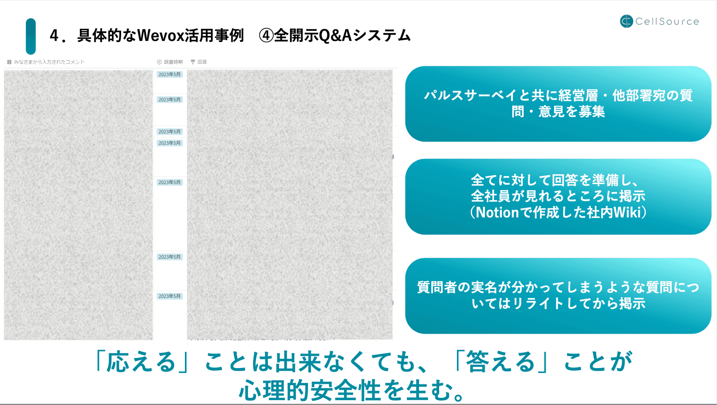 4つ目のWevox活用事例が全開示Q&Aシステムです。Q&Aを全開示しているとお話ししましたが、このようにNotion上にパルスサーベイの皆さんからのコメントを載せています。画面は隠していますが、私とHR戦略部長が30〜40ぐらい寄せられる質問全てに回答します。