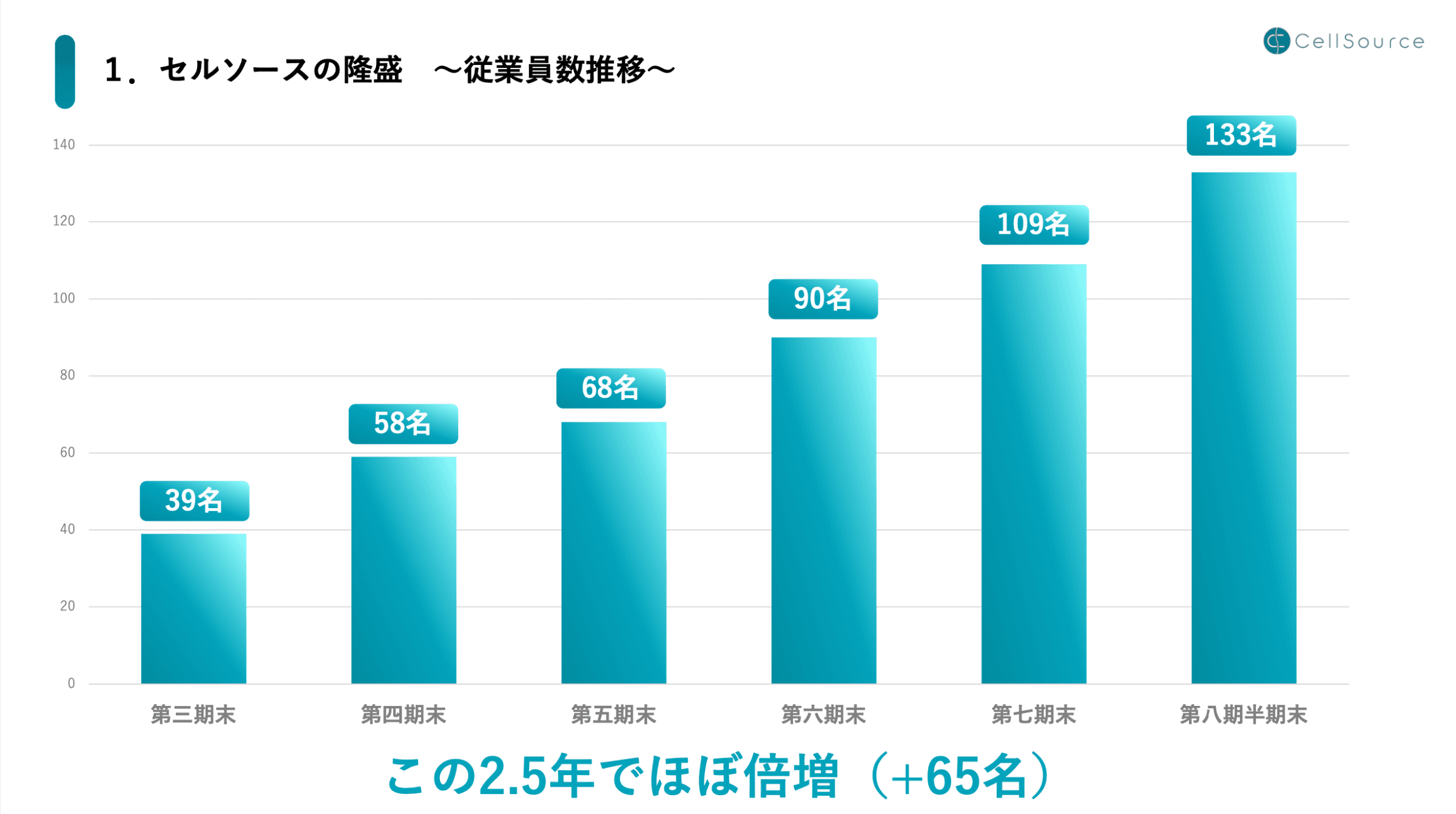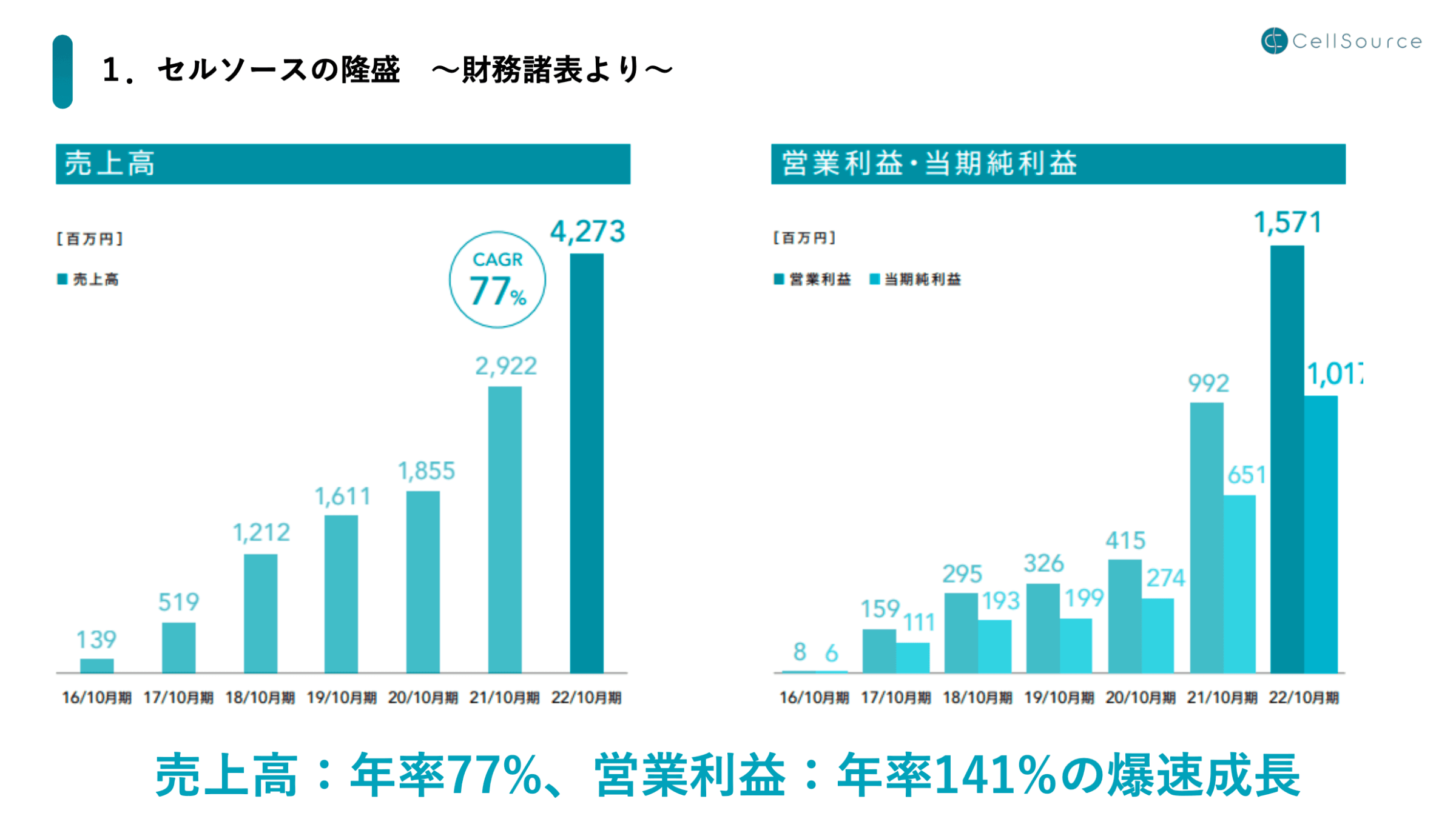 では、徐々にセルソースの実態に迫っていきたいと思います。まず、セルソースの業績はおよそ年率70〜80%で伸びていて、税後利益で見ると年率100%以上の伸びを示しています。営業利益は創業来黒字が続いており、直近では10億円を超えました。