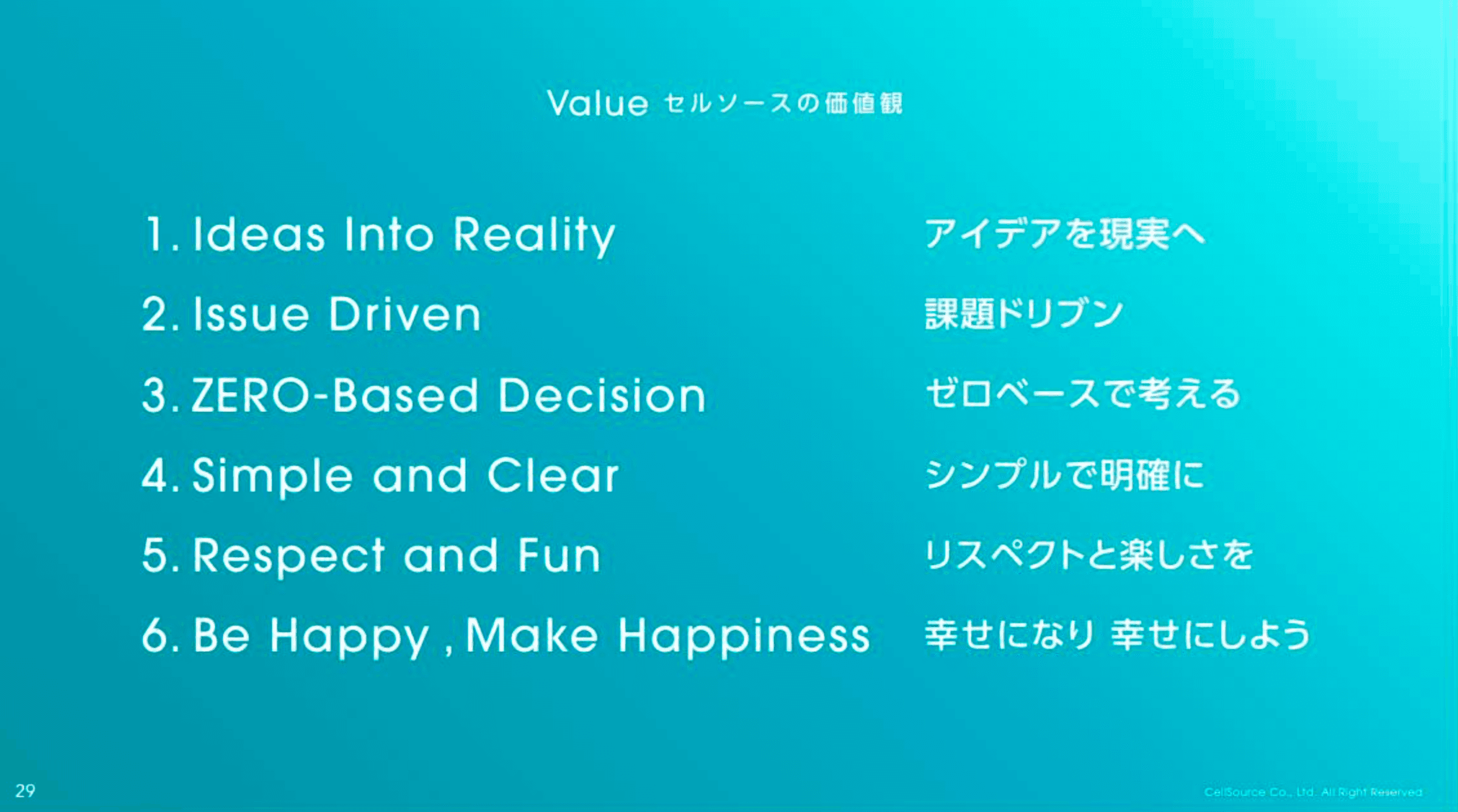 そして、バリューが6つあり、さらにそれを「行動規範」に分解した、22個の「セルソース思考22」があります。