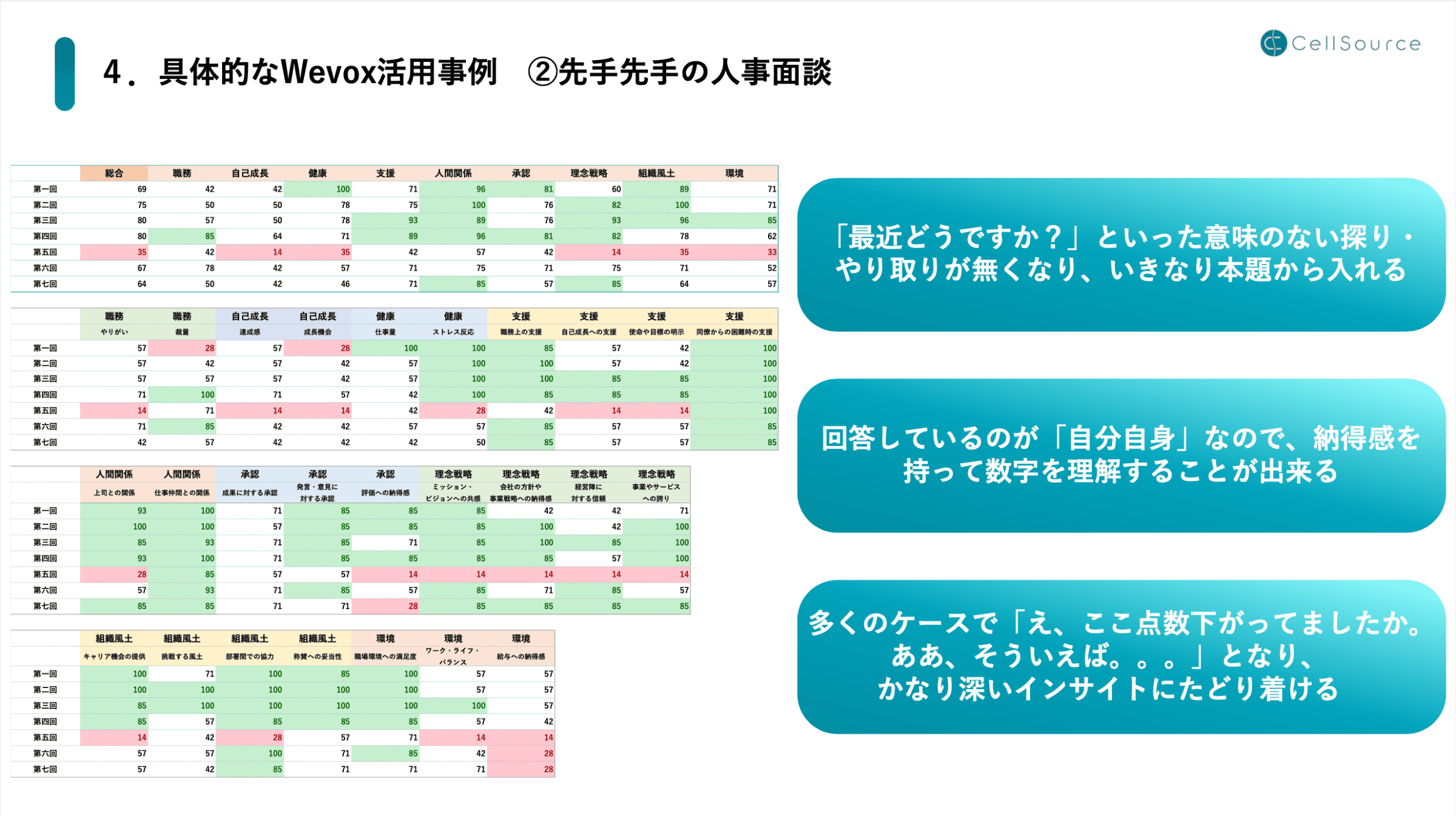 細田:開始から1分ぐらいアイスブレイクしたら、そのまま画面に数値を出して説明します。みんな見たことがないものなので、まずはその表の説明に少し時間をかけますが、それが終わった後は画面を指さしながら点数について話を進めます。